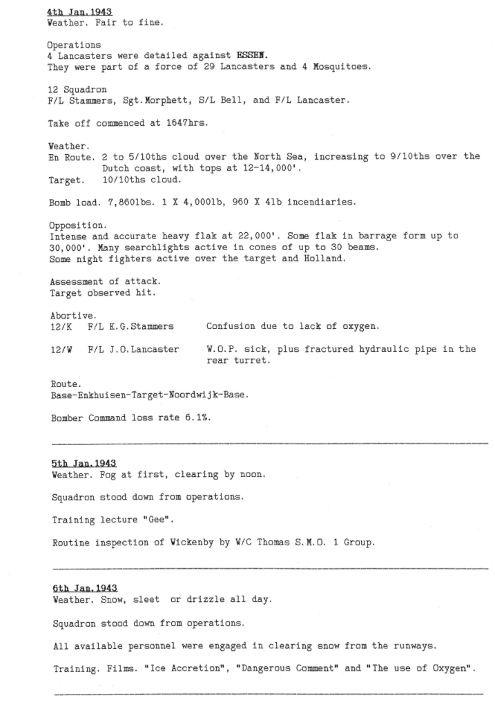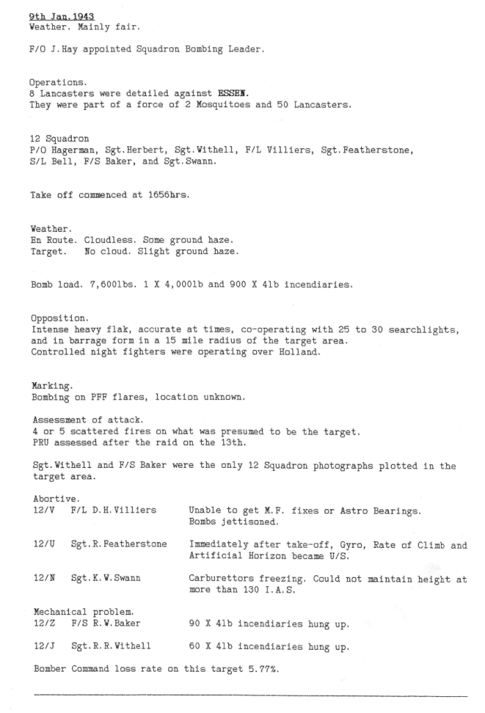 From November 1942 to January 1943, 12 Squadron had spent much of their time converting from Wellington bombers to Lancaster bombers and the missions below were some of the first flying the new type. They were the first squadron in 1 Group to convert.