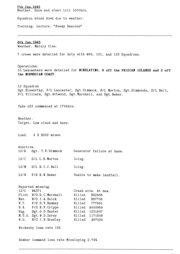 All of the information in the next section is taken from the Appendix to the Operational Record Book (RAF Form 541) compiled by 12 Sqn immediately after each mission. The further details recorded at the end were collated after the war by members of the Wickenby Register from information in the National Archives, the Public Records Office and from aircrew recollections. The Wickenby Register was an affiliation of ex-aircrew who served at Wickenby on 12 and 626 Squadrons – they had regular get-togethers at Wickenby every September until 2017, were responsible for the Icarus Memorial at the main entrance and issued a monthly newsletter.
