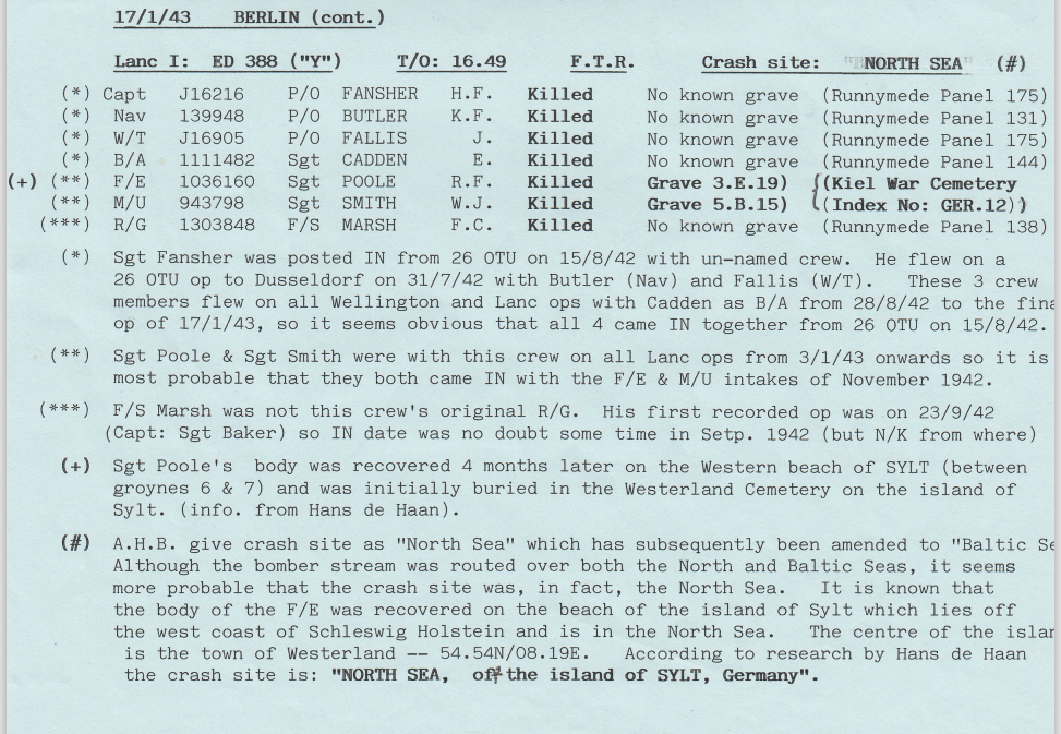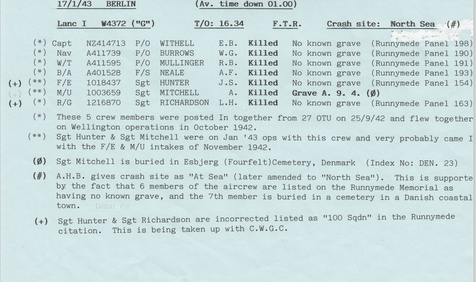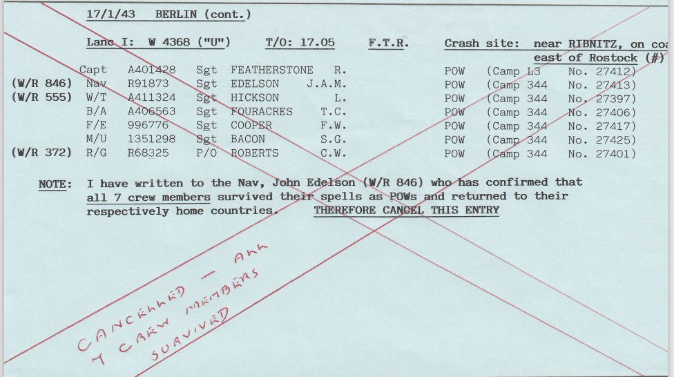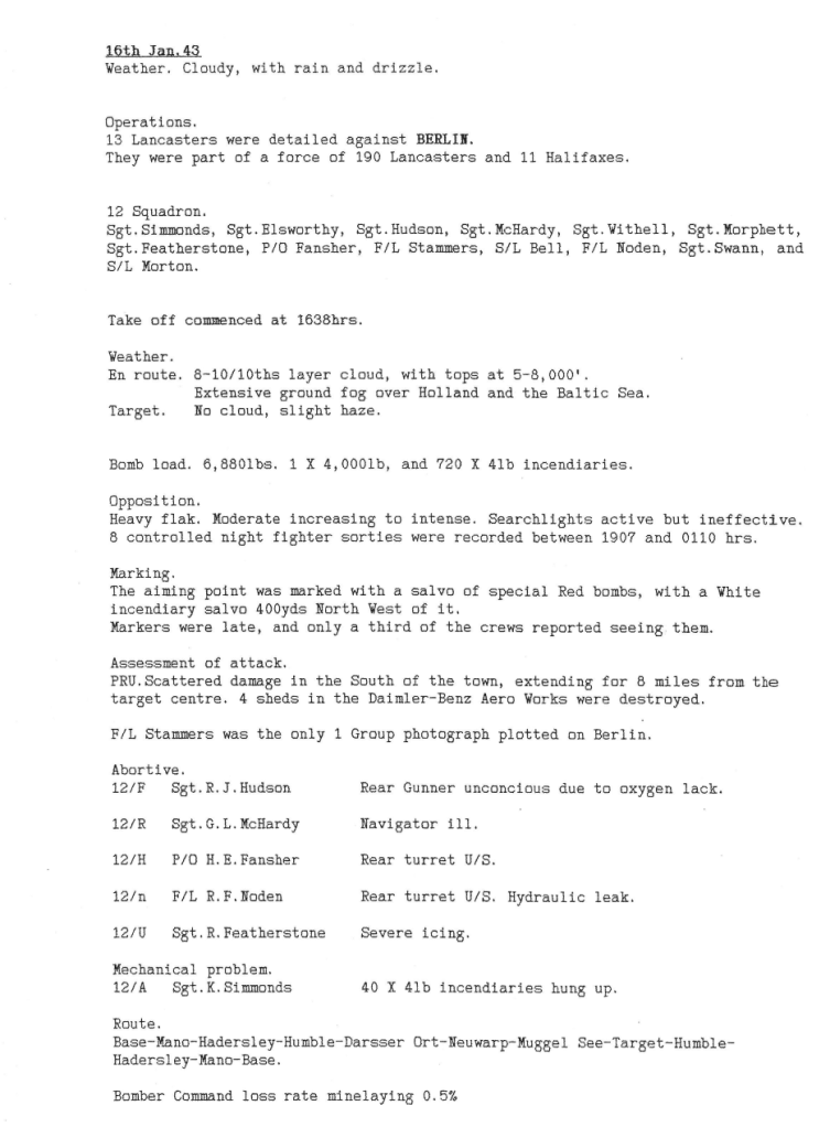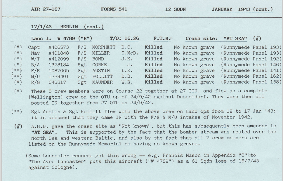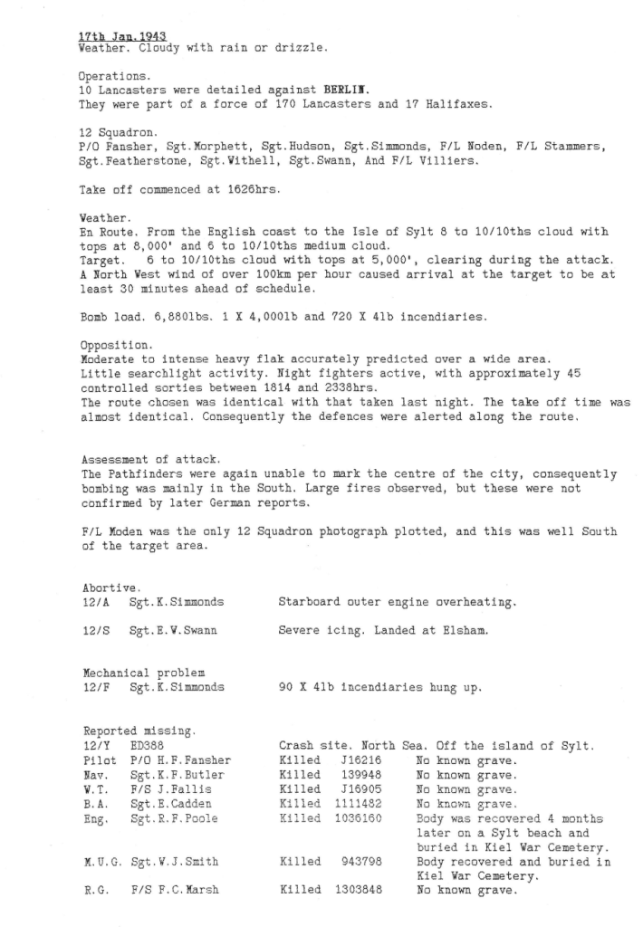 - 17/1/43 BERLIN – l0 a/c – FOUR AIRCRAFT WERE REPORTED MISSING:- Sgt WITHELL: Sgt FEATHERSTONE; F/S MORPHETT: P/O FANSHER