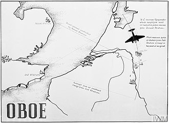 Oboe was a British bomb aiming system developed to allow their aircraft to bomb targets accurately in any type of weather, day or night. Oboe coupled radar tracking with radio transponder technology. The guidance system used two well separated radar stations to track the aircraft. Each Oboe tracking station used radio ranging to define a circle, the radius of which was the distance from the station to the target, the third point in the triangulation. The two circles intersected at the target. Radar pulses from each station were picked up by a transponder mounted in the aircraft. The aircraft transponder transmitted the signals back to the stations, after a slight delay. By assessing the time it took for the signal to return the distance between the station and the aircraft could be determined. One tracking station, the Cat station, was used to adjust the aircraft’s flight path. The other station, the Mouse, was used to key the bomb release point. Oboe, in essence, was a ground-controlled, blind bombing system. (Wikipedia)
