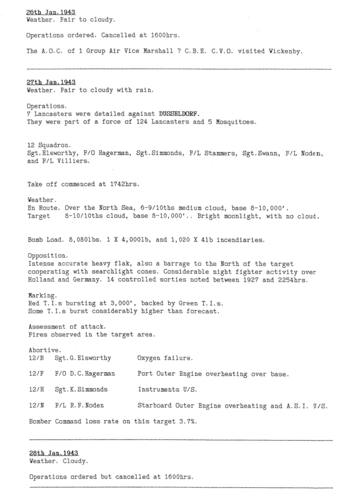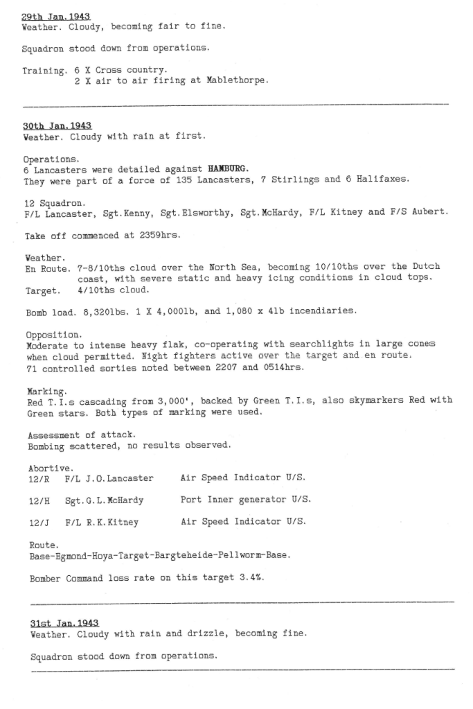 12 Sqn suffered no casualties during this week but did dispatch 13 aircraft on missions to Dusseldorf and Hamburg, although only 6 attacked the targets. Bad weather was the order of the day for most of the week.