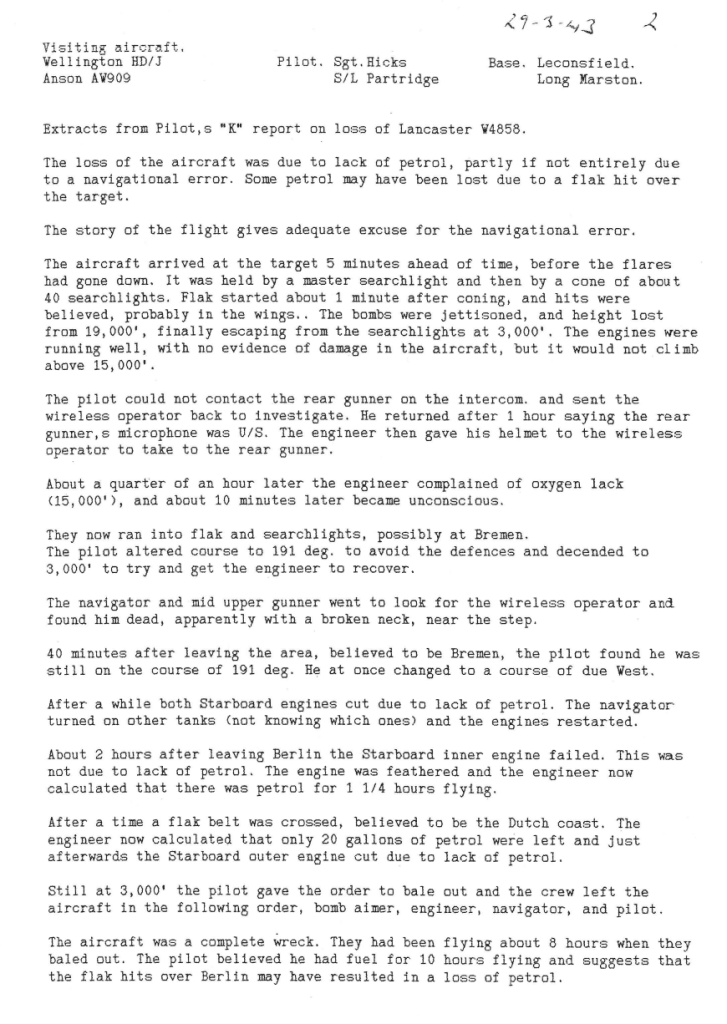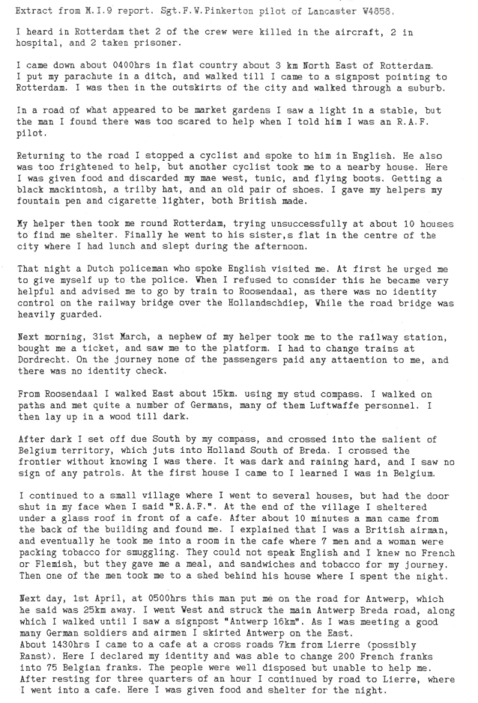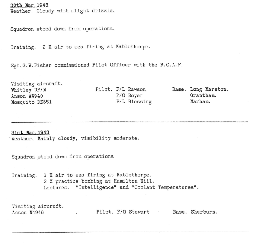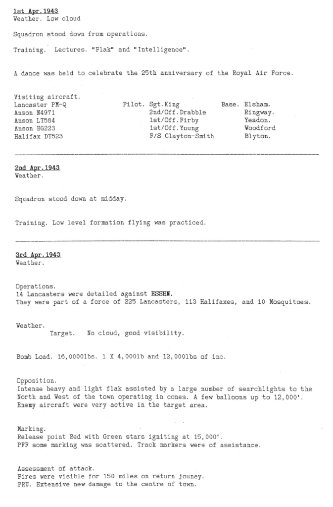 The Battle of the Ruhr was still in full swing and 12 Sqn took part in 3 operations this week, to Berlin, Essen and Kiel. One aircraft was lost in the attack on Berlin. The account written by Sgt Pinkerton, the pilot of the aircraft lost, who managed to evade capture and reach Gibraltar, not only shows the determination and character of Bomber Command aircrew, but also the courage and ingenuity of ordinary members of the public in the occupied countries of Western Europe at that time. Also of note is that the operational records for 12 Sqn for the month of April are missing from the National Archives therefore some of the information is sparse for that month.