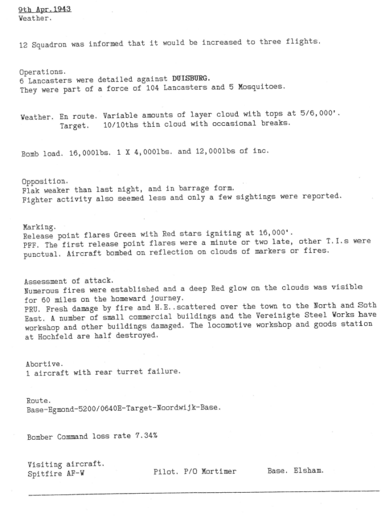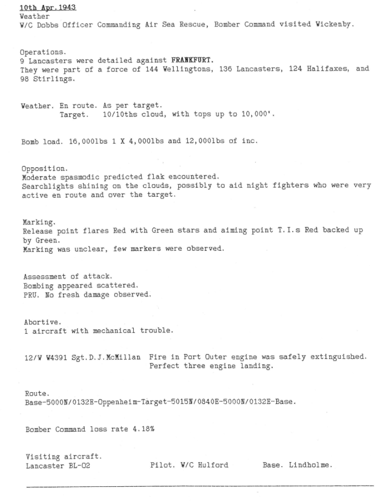 12 Sqn took part in 3 operation this week on three consecutive nights, 8,9 and 10th April, to Duisburg twice and then Frankfurt – there were no casualties. The attack on Frankfurt was through complete cloud cover and led to a failure. Bombing photos showed only cloud and Bomber Command had no idea where the bombs had fallen.