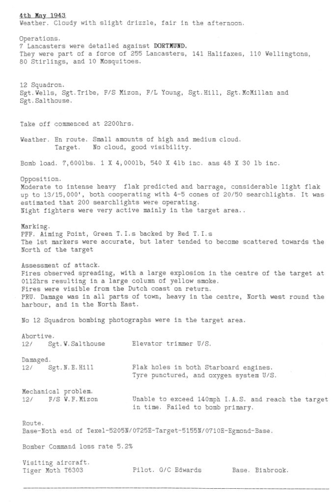 Following the heavy losses of the previous week, 12 Sqn only took part in one operation this week, to Dortmund, in the Ruhr, on 4/5 May – there were no losses. Apart from the “1000 bomber raid” on Cologne in 1942, this was the largest raid of the war so far, 596 aircraft and the first major attack on Dortmund. Pathfinder marking was accurate and the majority of the main force bombed within 3 miles of the target which resulted in severe damage in the central and northern parts of the city. 693 people were killed and 1,075 injured, another new record.