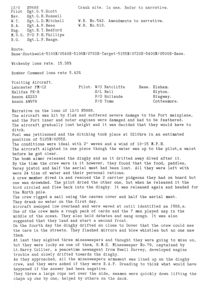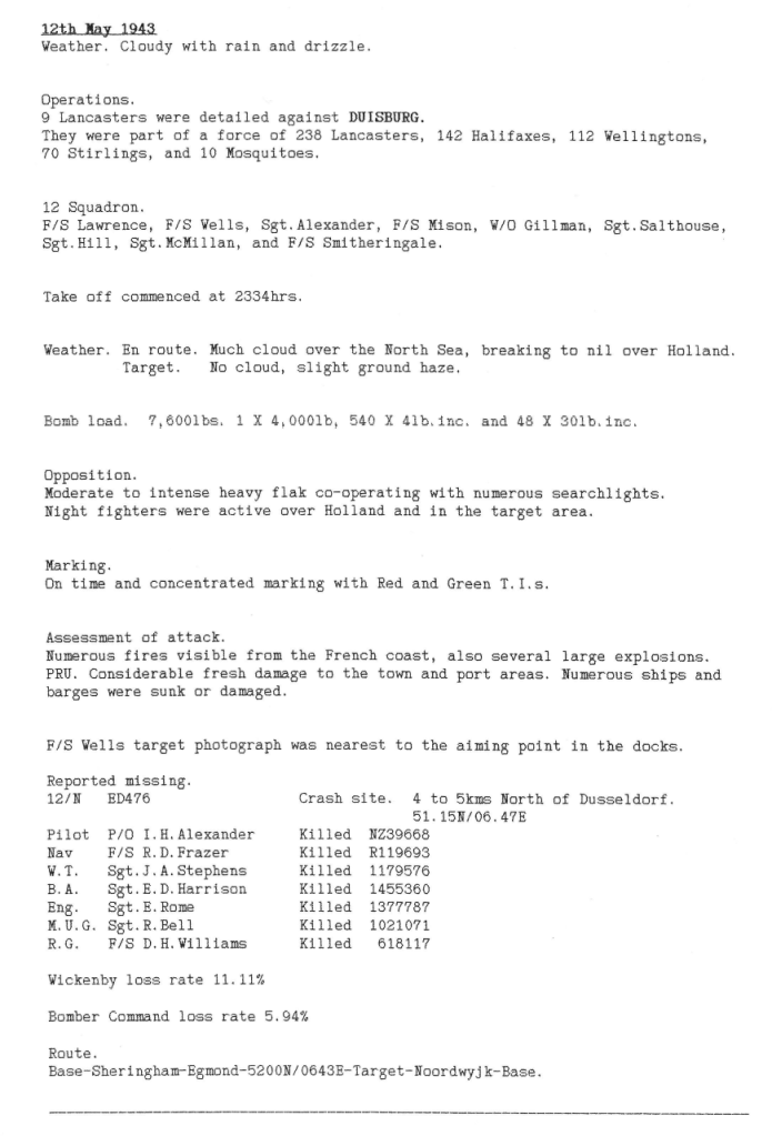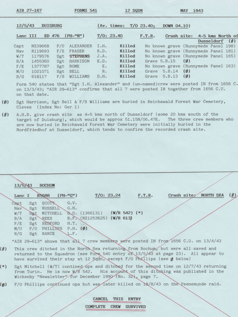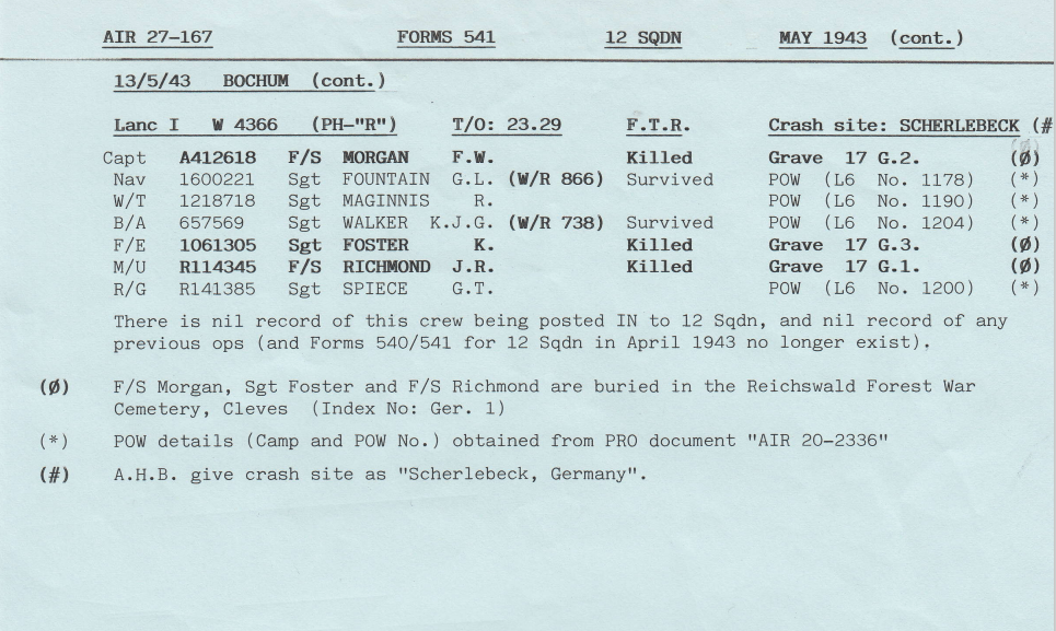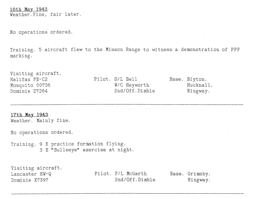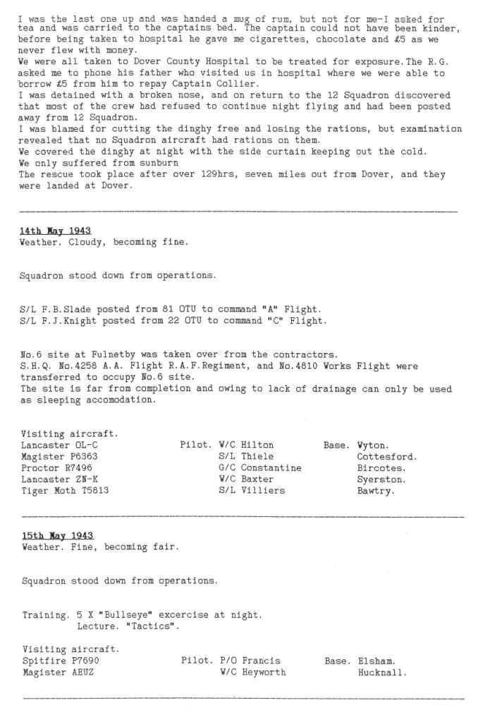 This was the week of the Dambusters Raid (Operation Chastise), but 12 Sqn carried out 2 operations, to Duisburg and Bochum and 3 aircraft were lost, one landing in the North Sea, with all the crew eventually being rescued after 129 hours in the aircraft dinghy (see first hand report below). You will also notice in the Station Diary entry for 13 May that Flt Lt J.O. Lancaster was posted following completion of his second tour – an unusual achievement – but he was also one of the original 617 Sqn pilots, but left during training and did not take part in the mission to the dams. He was also one of the aircrew interviewed on the Sky TV documentary “Lancaster”, released last year.