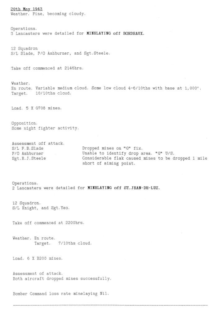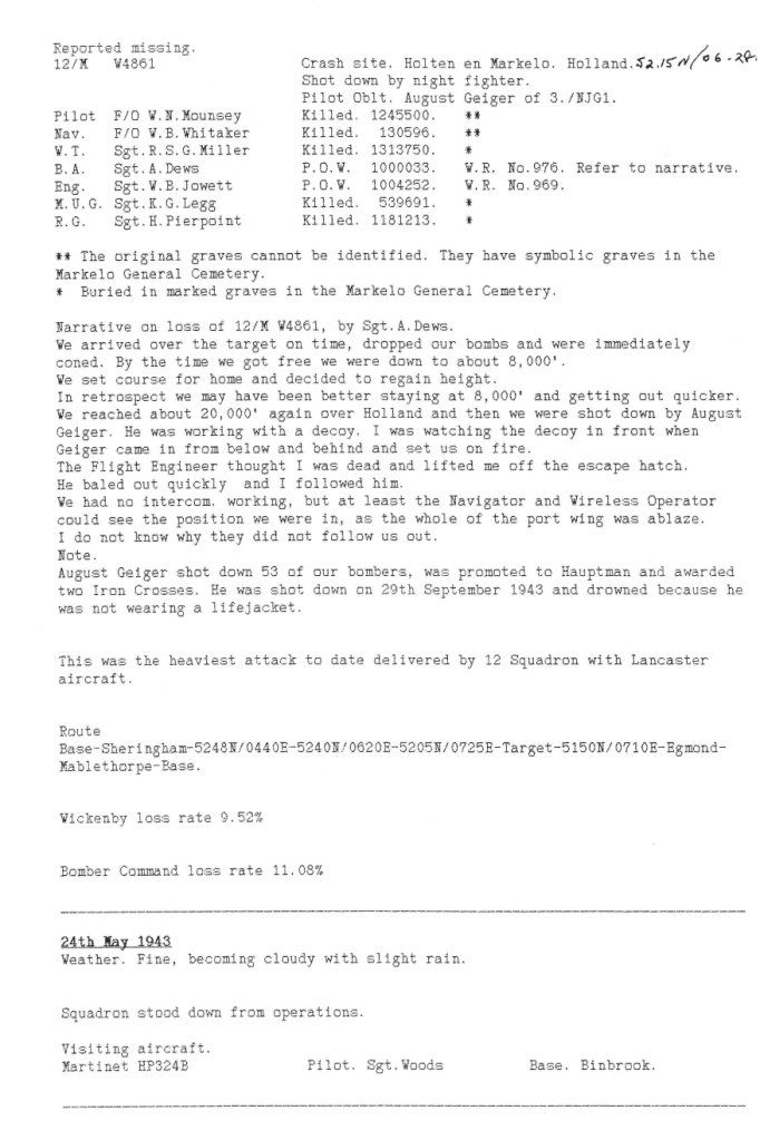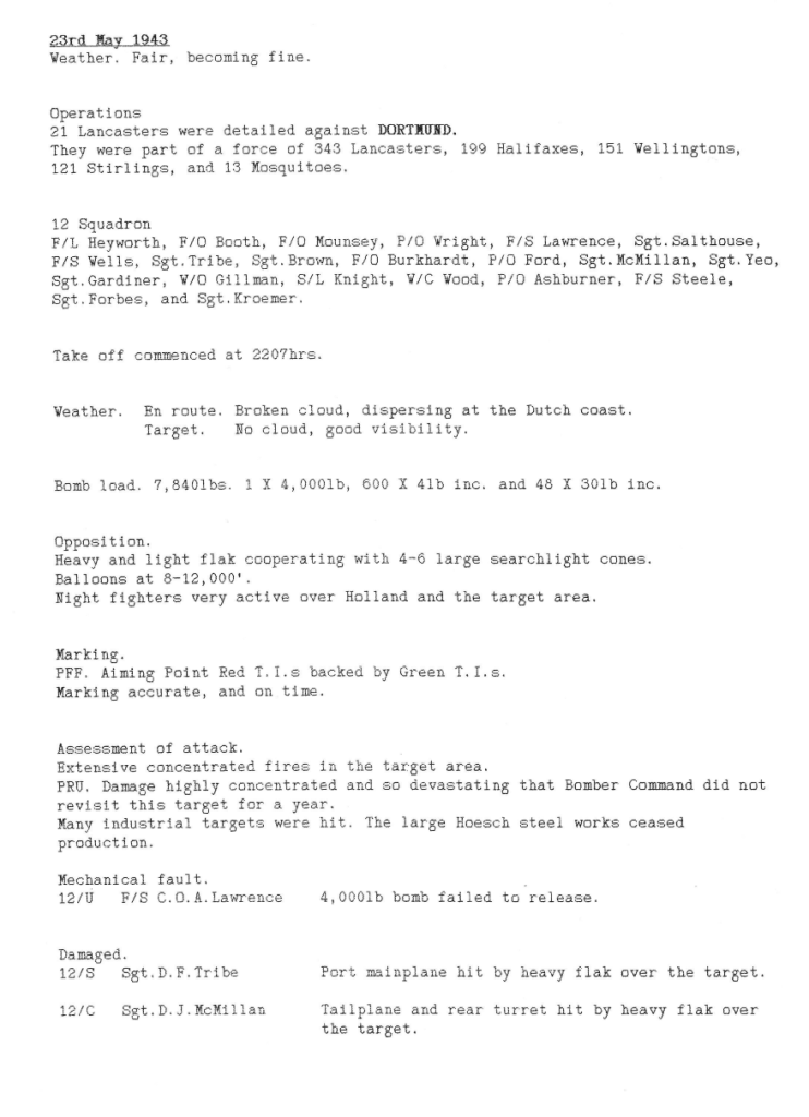 The attack on Dortmund was the largest carried out by Bomber Command during the Battle of the Ruhr (826 aircraft dispatched) and the largest effort so far by 12 Sqn – 21 aircraft. It was a very successful raid and nearly 2000 buildings were destroyed, including the large Hoesch steelworks, which ceased production. 599 people were killed and 1.275 were injured.
