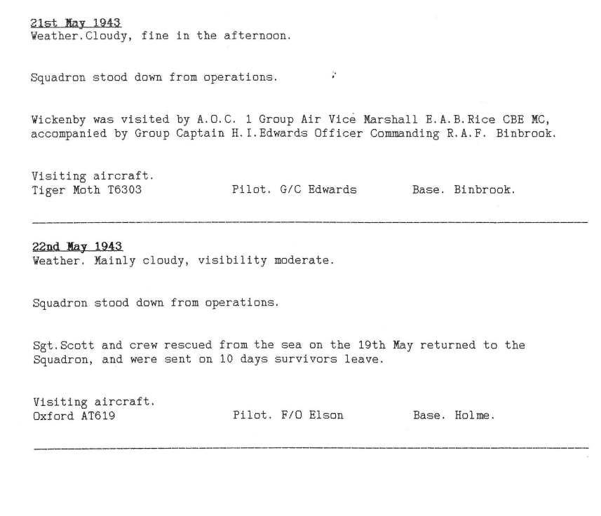 The unit was also visited, on 21st May, by the Air Officer Commanding 1 Group, Air Vice Marshall E.A.B. Rice CBE, MC.