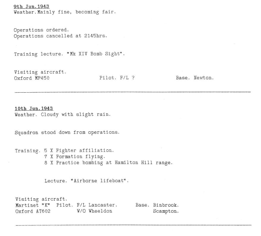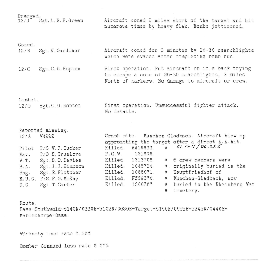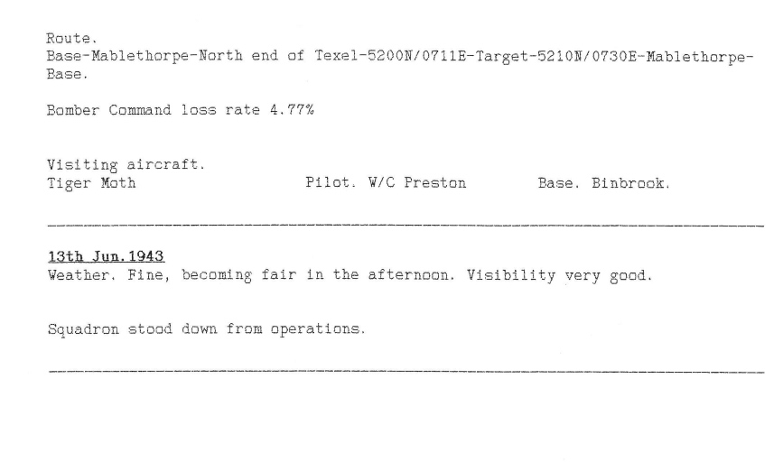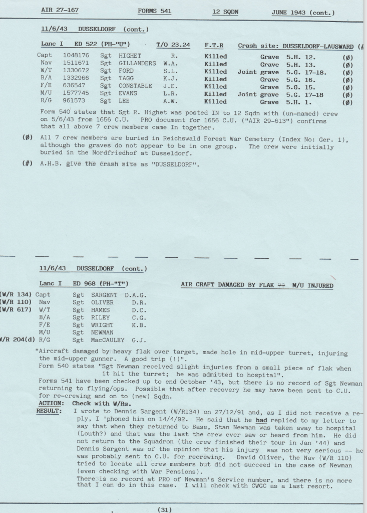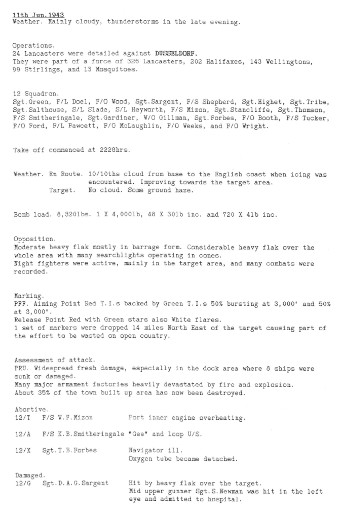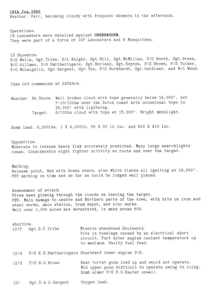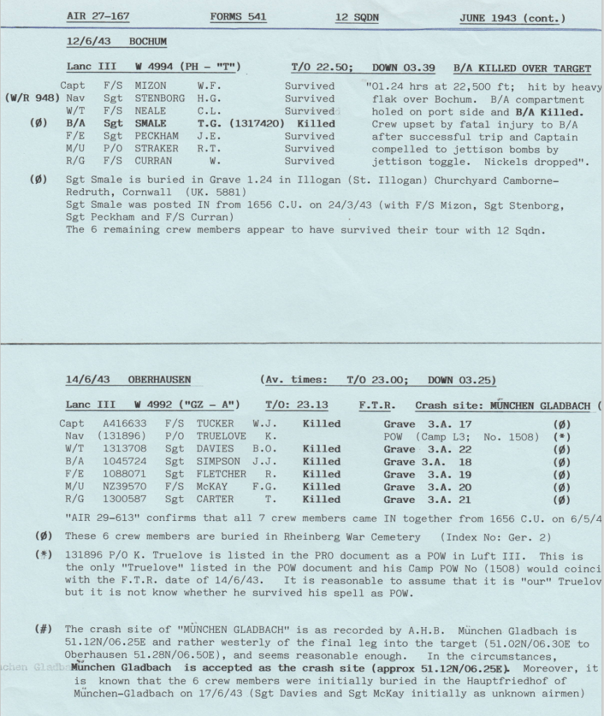 A very bad week for 12 Sqn, with 6 aircraft lost and 38 aircrew being killed and 4 becoming prisoners of war. 5 aircraft was lost during the attack on Dusseldorf on 11/12 June, the highest loss rate in a single night for the squadron for the whole of 1943 (20.83%). Other attacks were made on Bochum and Oberhausen.
