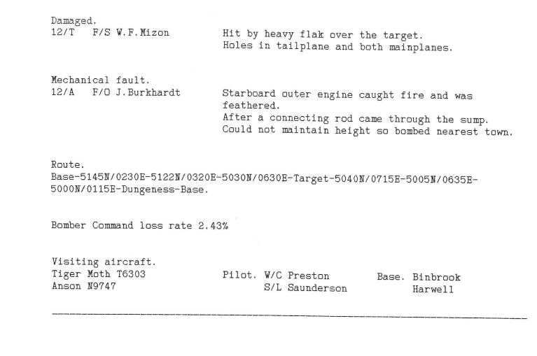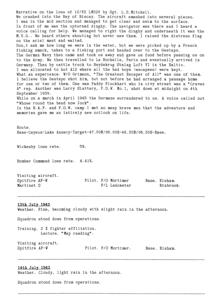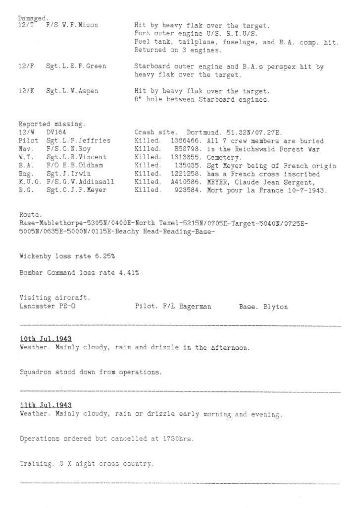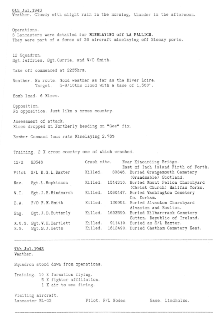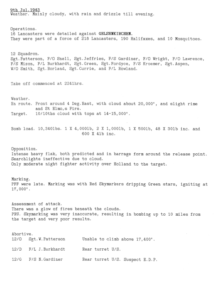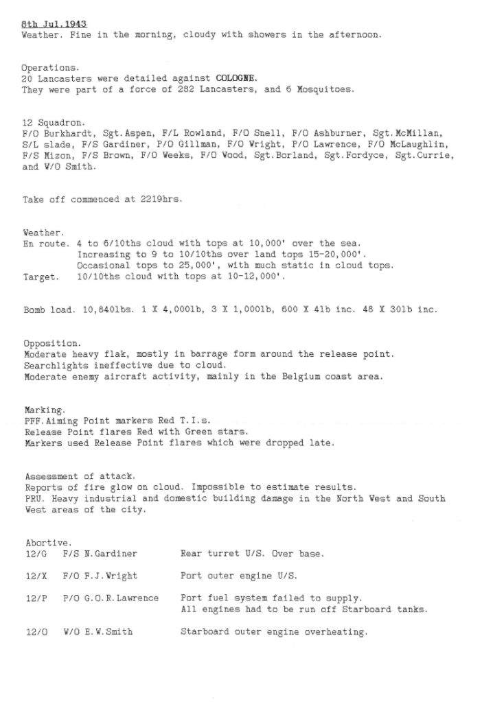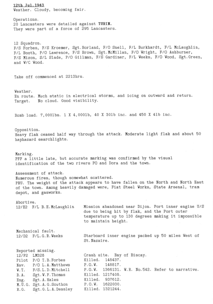 12 Sqn took part in one minelaying mission and three bombing operations this week, to Cologne, Gelsenkirchen and Turin. Two aircraft were lost on operations and one during a training exercise – 18 aircrew were killed and 4 became prisoners of war. Operations to Italy must have been pretty spectacular as the Lancasters had to fly over the Alps both out and back. This particular raid was the most successful of the ten against Turin carried out by Bomber Command.