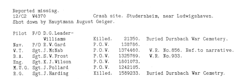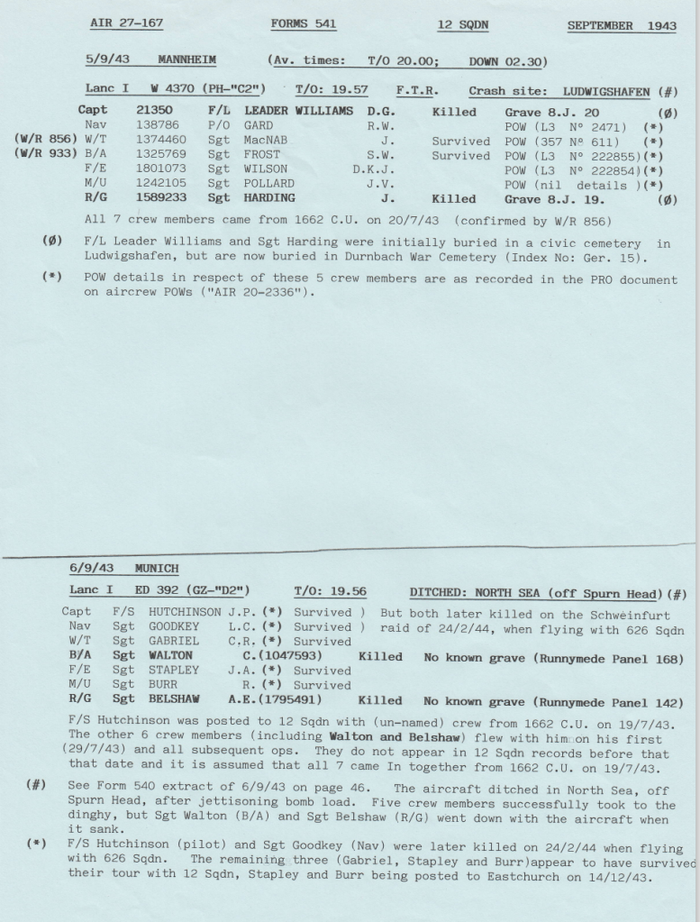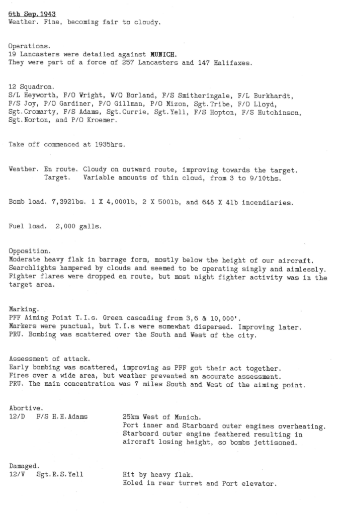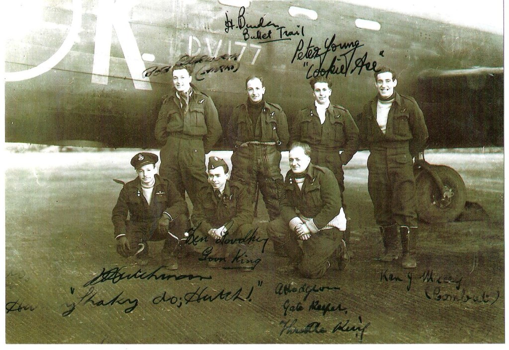 Flight Sergeant Hutchinson and 4 of his crew who ditched in the North Sea on the mission to Munich on 6th September – Back LtoR R Edgeworth, W/O – H Binder, AG – P Young, bomber – H Macey, A/G, Front LtoR J Hutchinson, Pilot – L Goodkey, Nav – A Hodgson F/Eng (Please note that the bomb aimer and the rear gunner drowned and have been replaced in this picture). Unfortunately, this crew were all killed, near the end of their tour, during the attack on Schweinfurt on 22nd February 1944