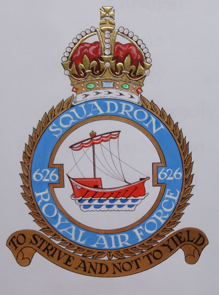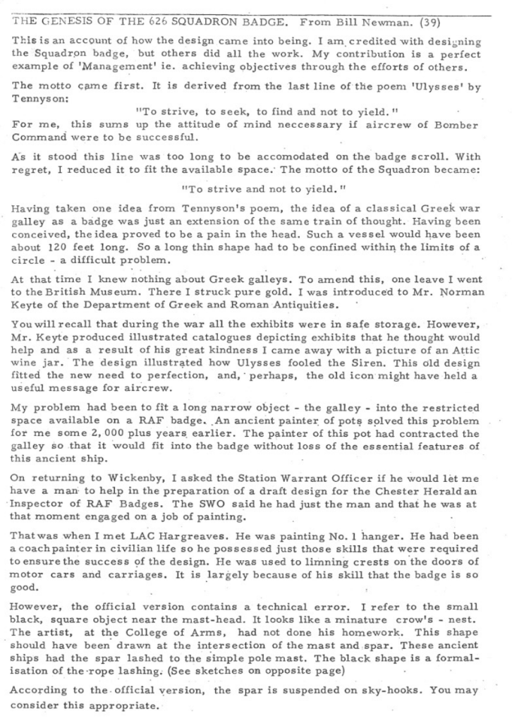 I’ve included an account from Flying Officer Bill Newman about how the 626 Sqn badge and motto was developed and designed.