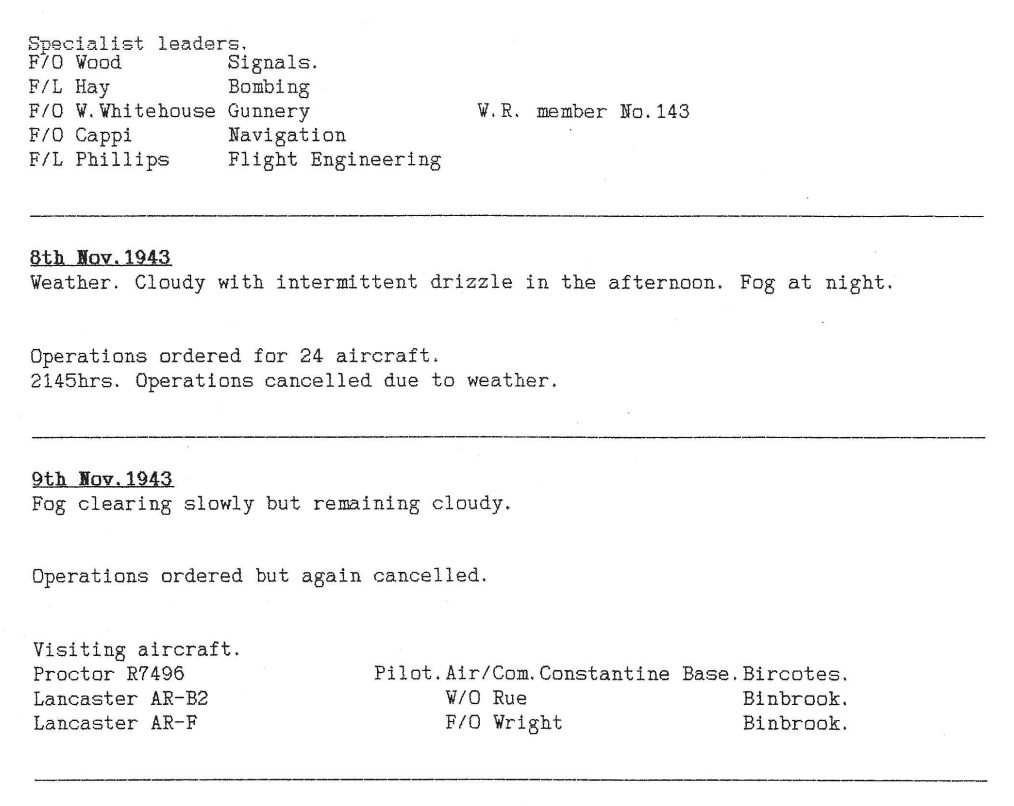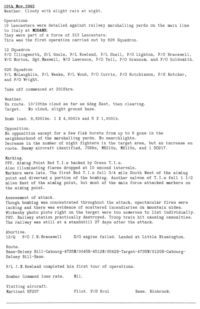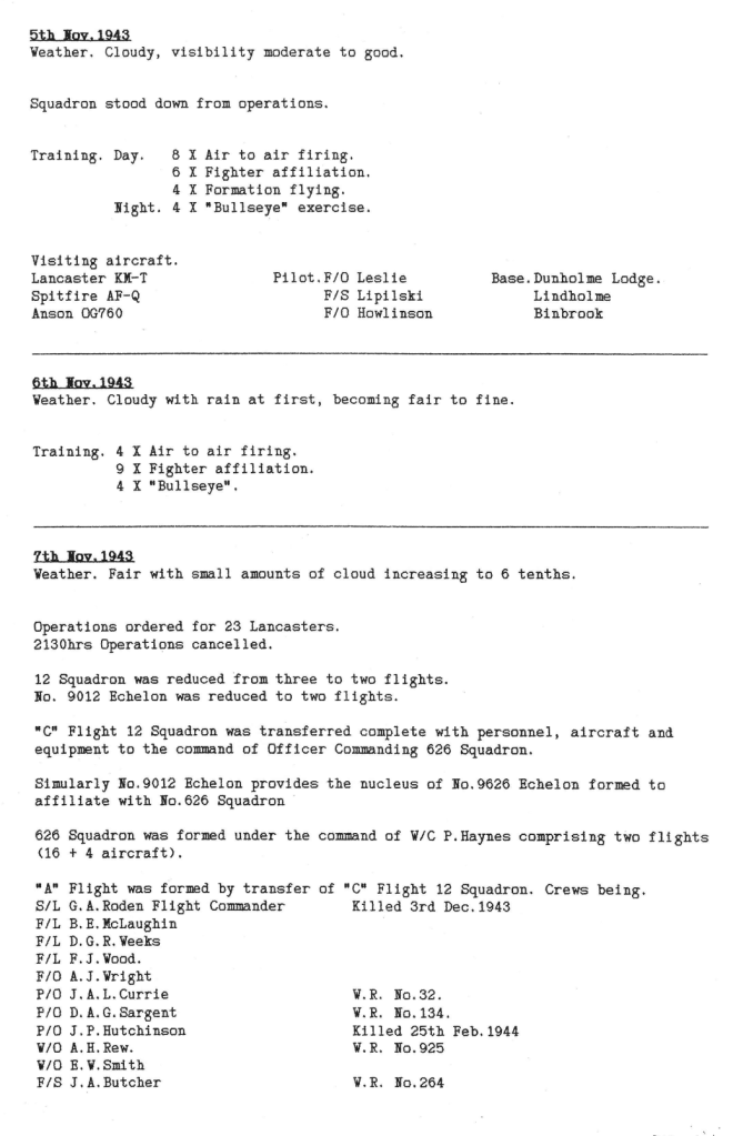 626 Sqn were formed on 7th November, to consist of two flights of eight aircraft, with four spares. The initial ‘A’ flight was formed by taking ‘C’ flight aircraft, aircrews and groundcrews from 12 Sqn with the remainder comprising crews straight from training and a few more experienced crews from other squadrons. A list of the first crews is in the Station Diary extract below. The commanding officer was Wing Commander P Haynes. Their first mission was to Modane in the French Alps on 10th November, which was a successful attack on the railway line and tunnels of the main line from France to Italy. There were no casualties.