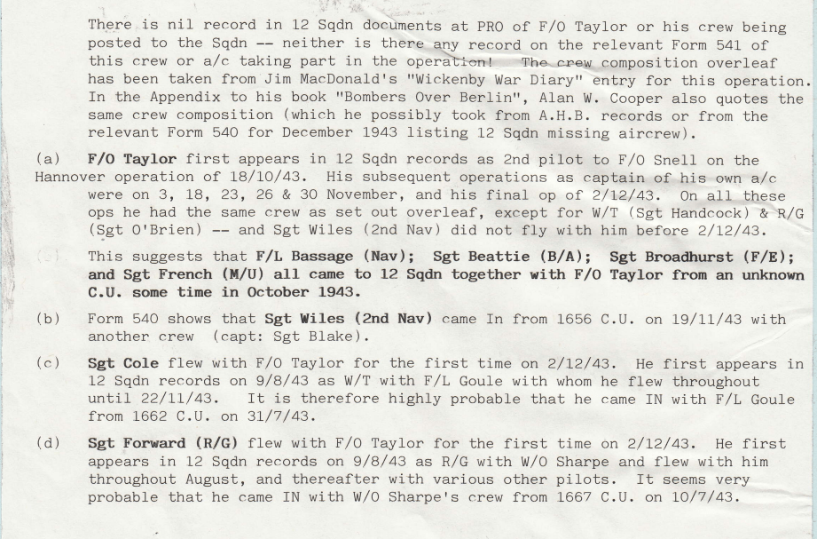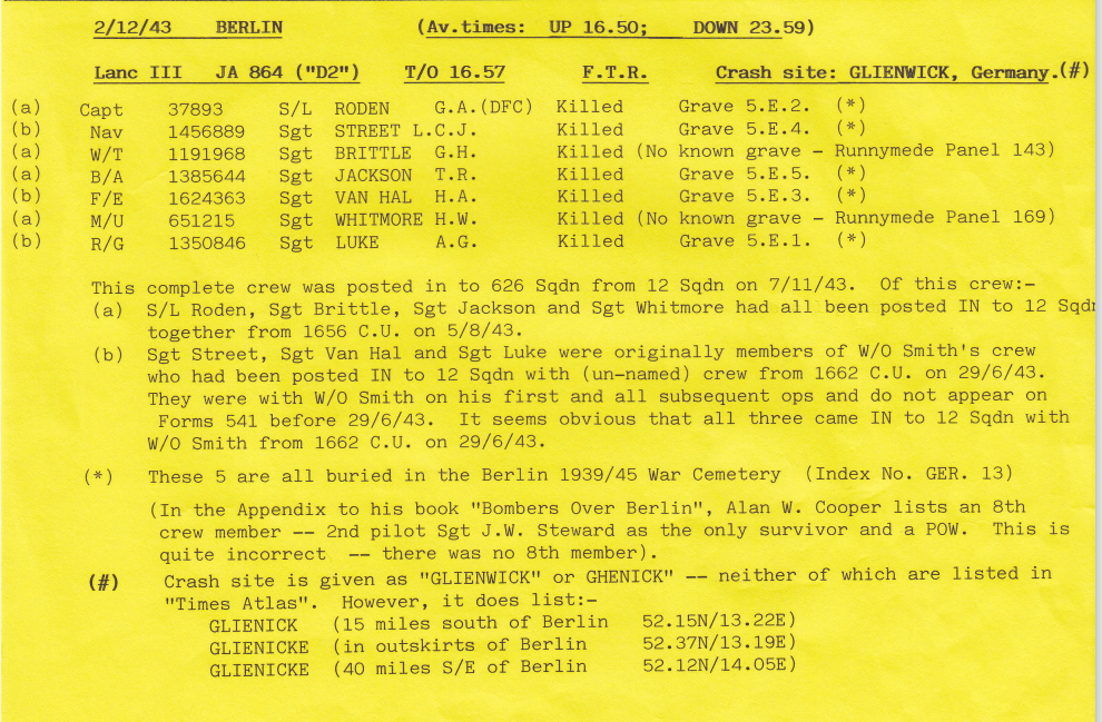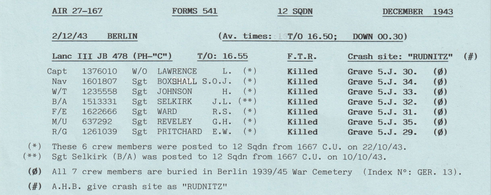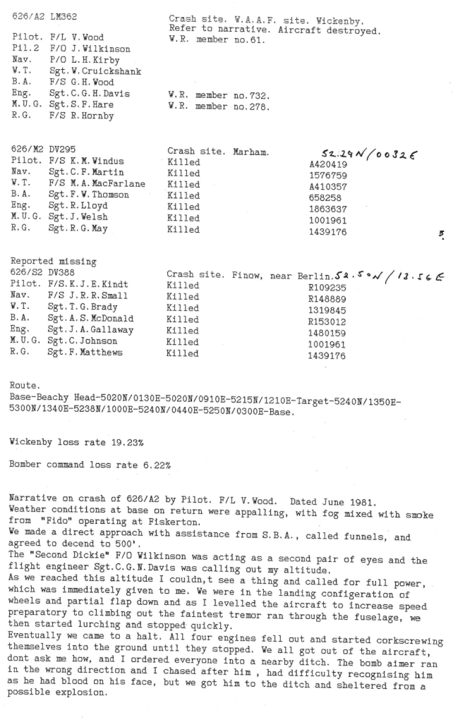 Flight Sergeant Keith Windus, aged 24, the son of George Henry & Pearl May Windus of Gumble, New South Wales, Australia, who was killed when the aircraft he was piloting crashed at RAF Marham, following the attack on Berlin on the night of 26/27 November 1943.Members of the crew of Warrant Officer Kindt, who were all killed during the attack on Berlin on 26/27 November 1943 – LtoR: F/Sgt Cecil Kindt RCAF – Pilot, Sgt Tommy Brady – WOP, Sgt Frank Matthews – RG, F/Sgt Roy Small RCAF – Nav, Sgt Stewart McDonnell RCAF – BASix members of the crew of Warrant Officer Leonard Lawrence, who were all killed attacking Berlin on the night of 2/3 December 1943 – LtoR: Sgt Gill, Sgt Fisher, Sgt Quinn, F/Lt Kitney, Sgt Lawrence, Sgt Boxall