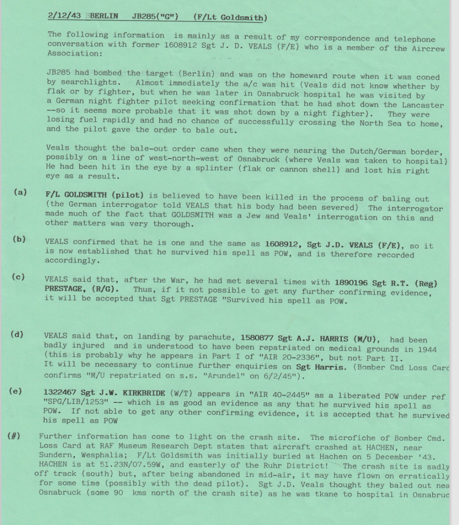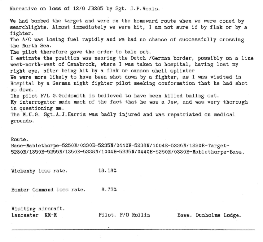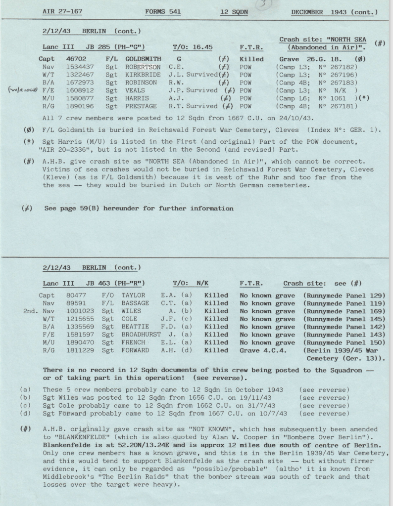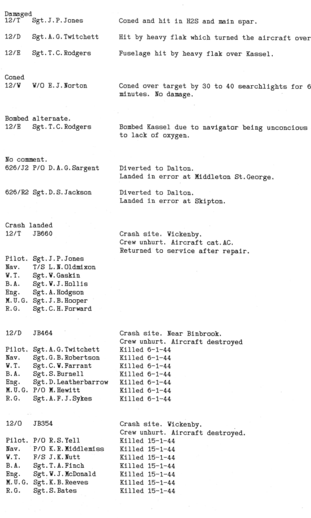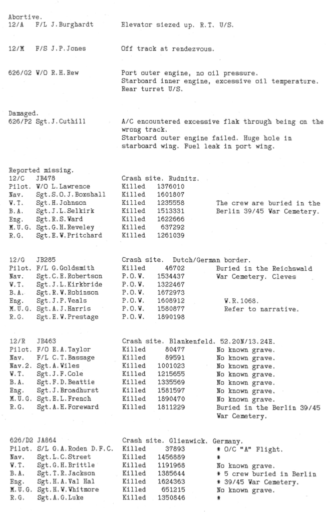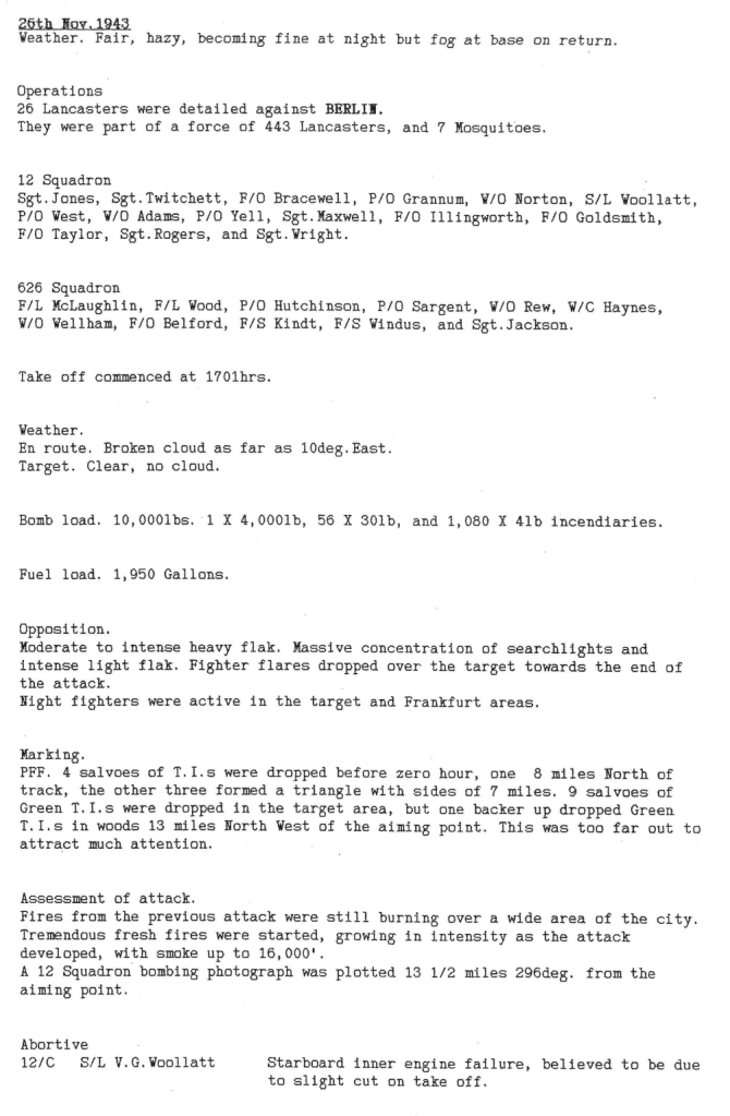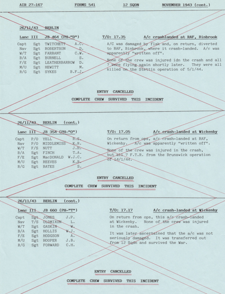 On returning from the attack on 26/27 November, 4 aircraft crashed on landing, 3 at Wickenby and one at RAF Binbrook – this was almost certainly due to fog over the airfields, as mentioned in the Station Diary below.