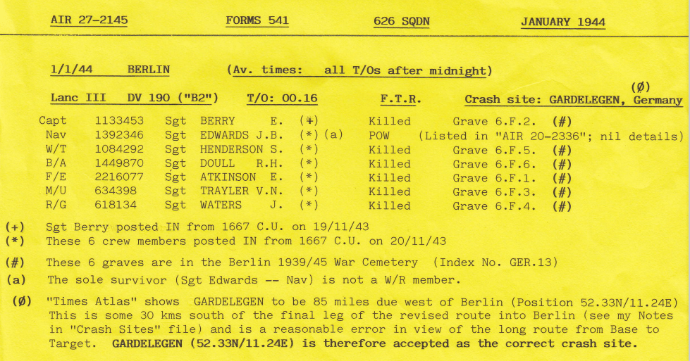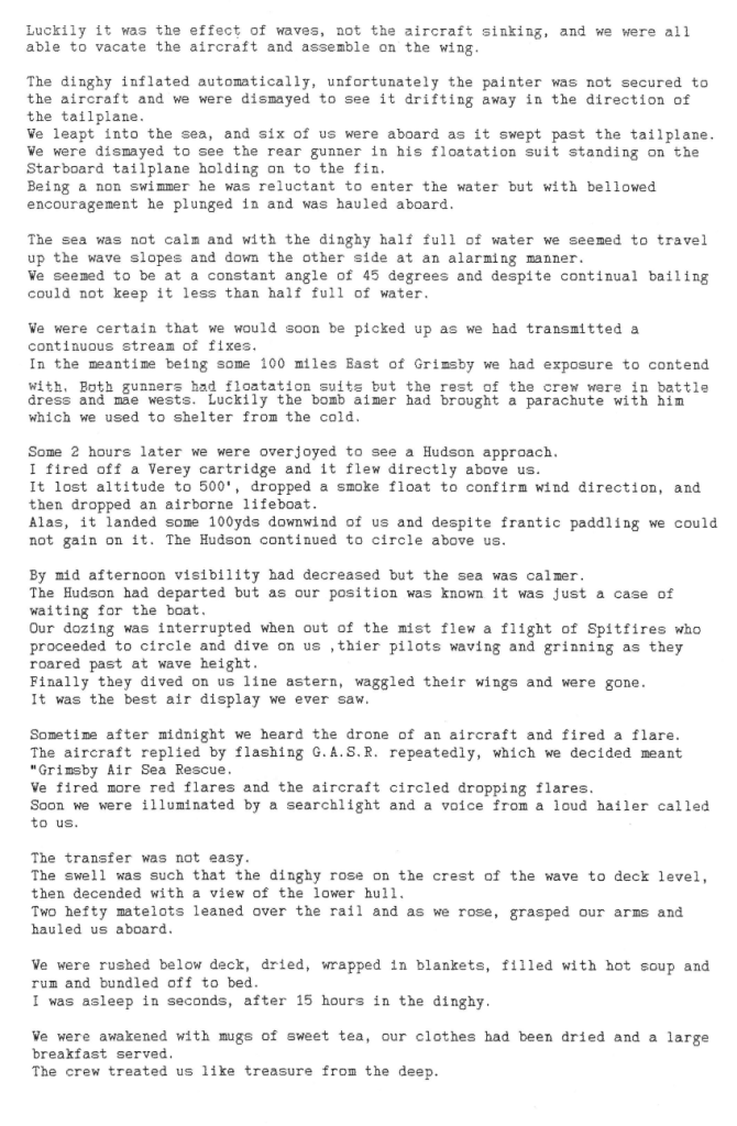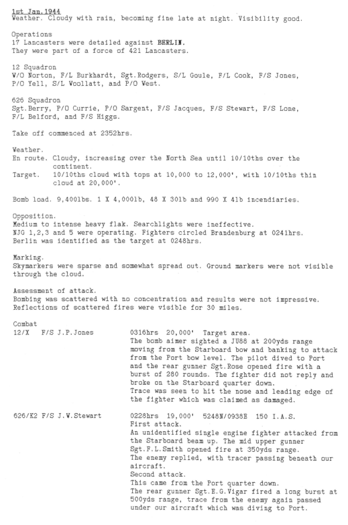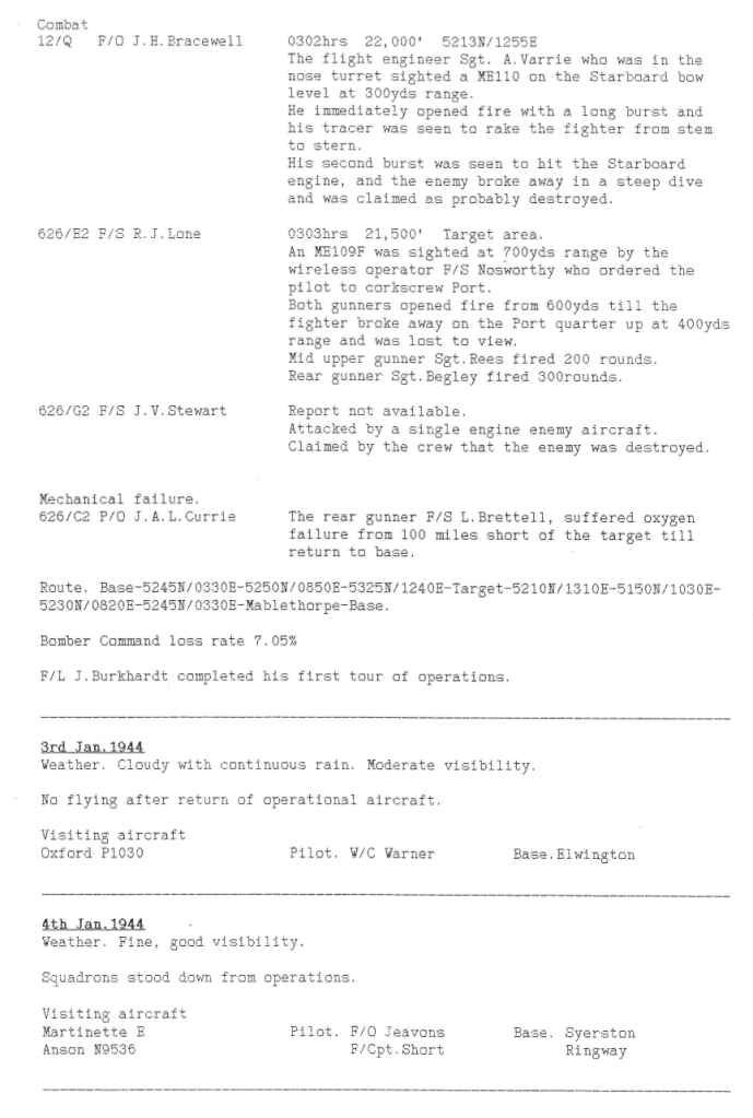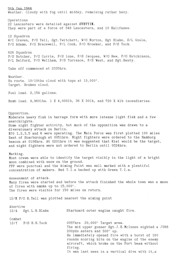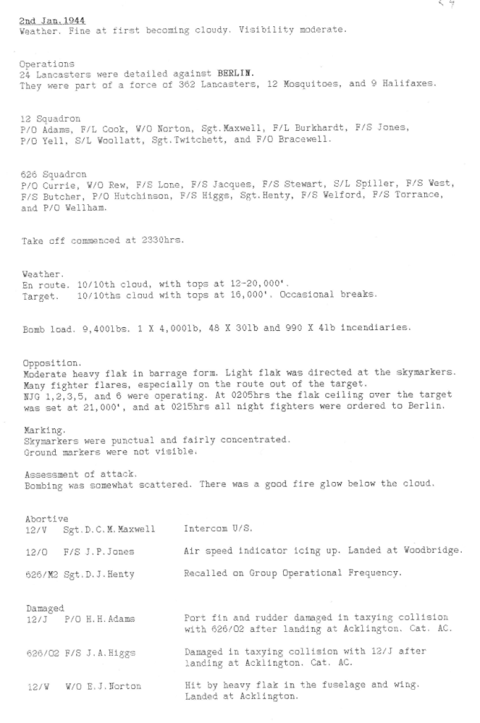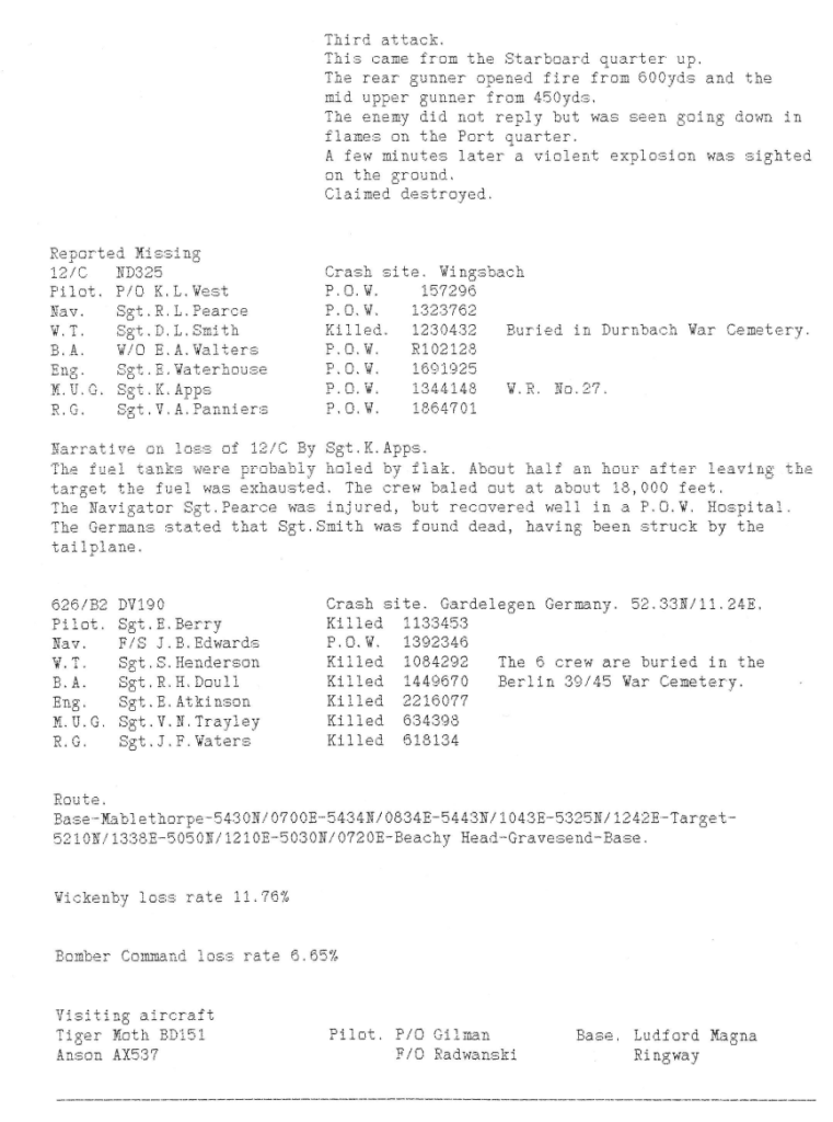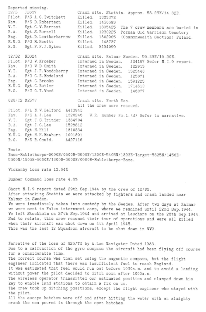 A busy week for the two Wickenby squadrons with successive nights attacking Berlin and a long range operation to Stettin, in what is now Poland. 5 aircraft were lost, 13 aircrew killed, 7 becoming POW’s and one entire crew interned in Sweden having crash landed on their way back from the attack on Stettin. One aircraft ditched in the North Sea off Grimsby and the narrative in the Station Diary gives a very descriptive account of another of the many dangers faced by Bomber Command crews.