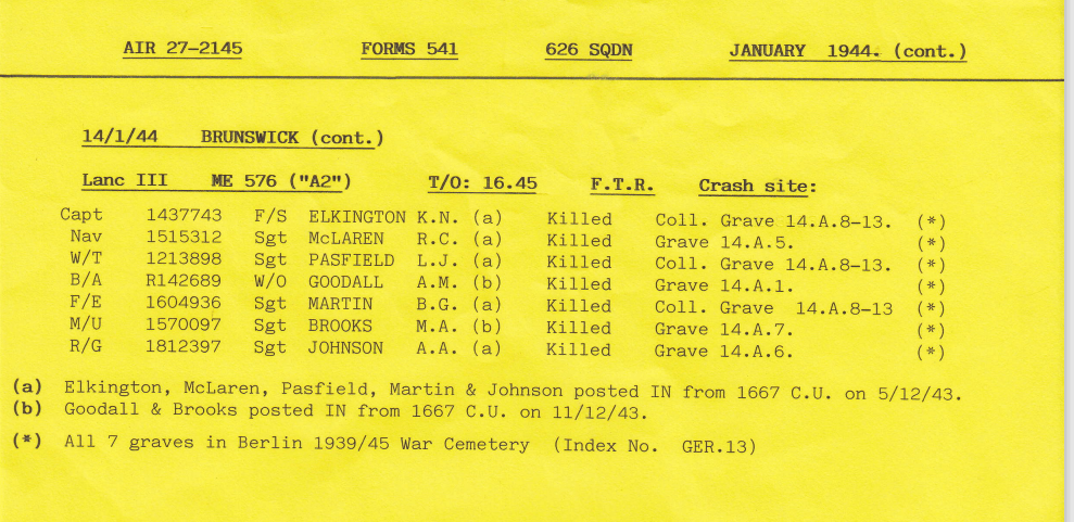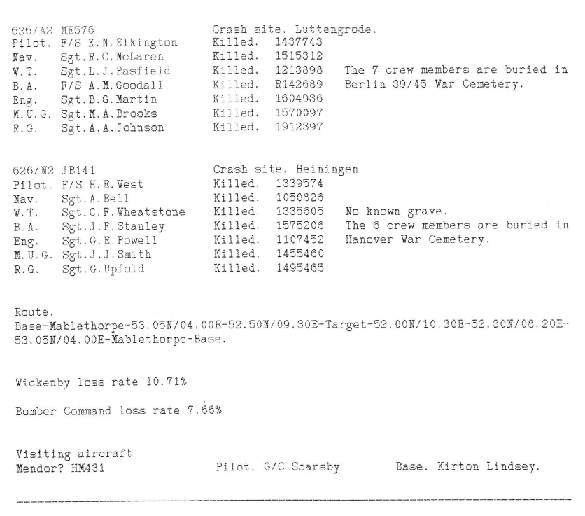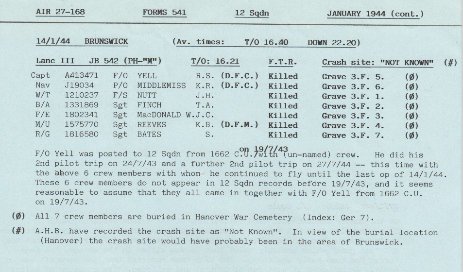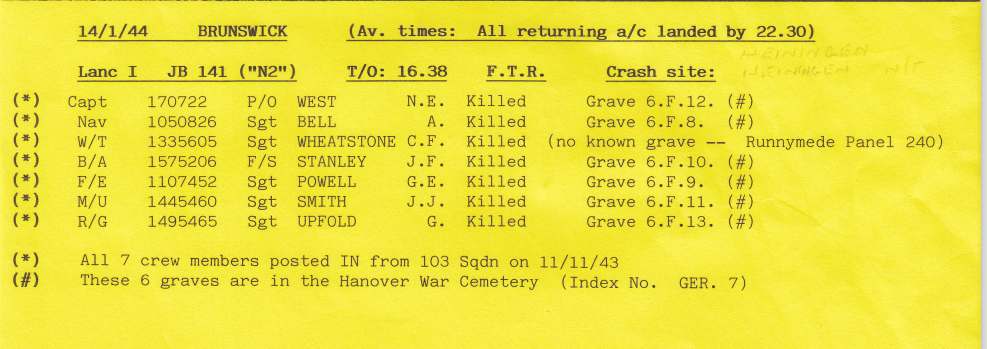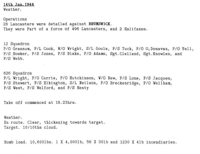 Both squadrons took part in 2 operations this week, to Brunswick and Berlin – 3 aircraft and all their crews were lost on the Brunswick attack. 38 Lancasters were lost on the Brunswick raid, 7.6% of the force, which was higher than normal, with the German controllers successfully deploying fighters all the way in and out. Neither attack was successful, unfortunately, with thick cloud cover over Berlin (a not unusual occurrence) and 11 Pathfinders were lost attacking Brunswick.