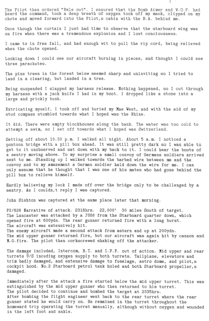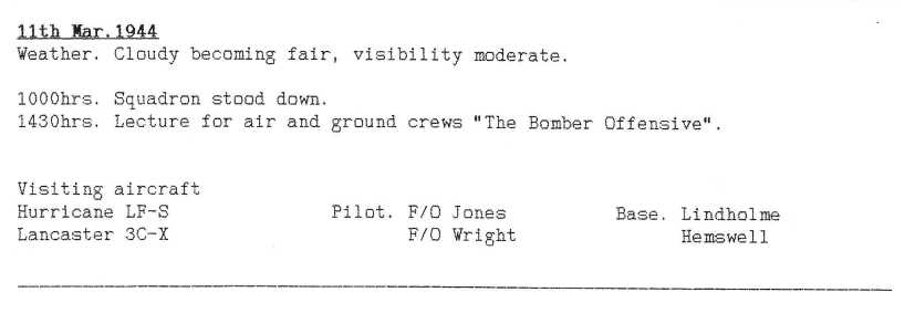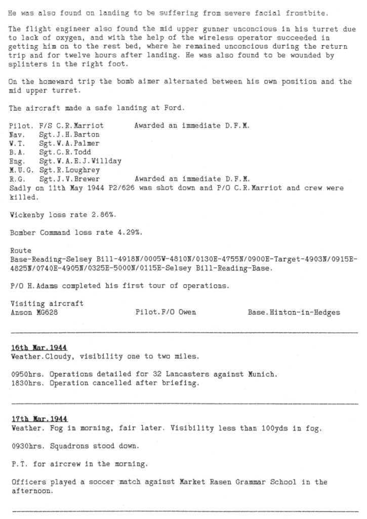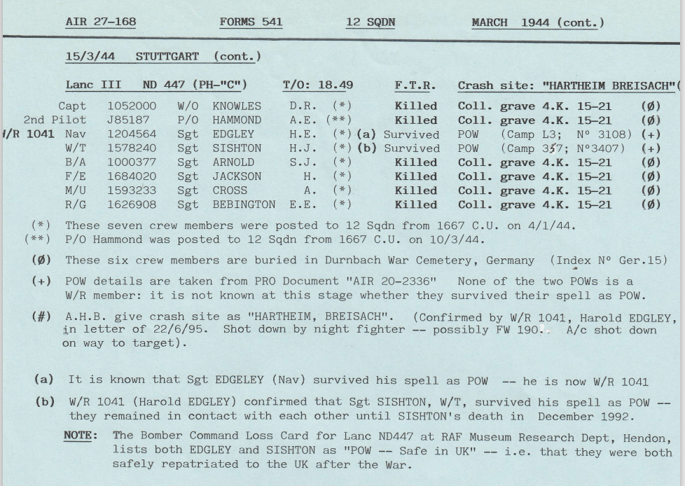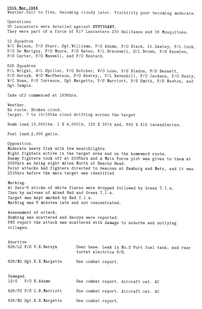 Just one operation this week, to Stuttgart on 15th March where one 12 Sqn aircraft was lost with 7 aircrew being killed and 2 becoming POW’s (see narrative from the navigator below). One of the crew killed was Pilot Officer Albert Hammond, a Canadian aged 25, the son of Albert & Alice M Hammond of Winnipeg, Manitoba, Canada. He had only arrived at Wickenby 5 days before and was flying as a “second dicky” pilot on his first mission.
