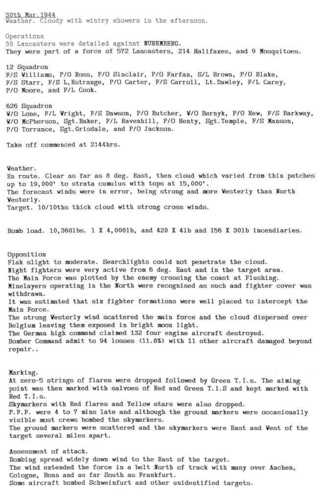 The raid on Nuremburg became the worst night of the war for Bomber Command with 95 bombers lost along with 545 aircrew deaths, mostly by night fighters on the way to the target – only 9 were lost on the return leg as the Germans had to land to refuel.