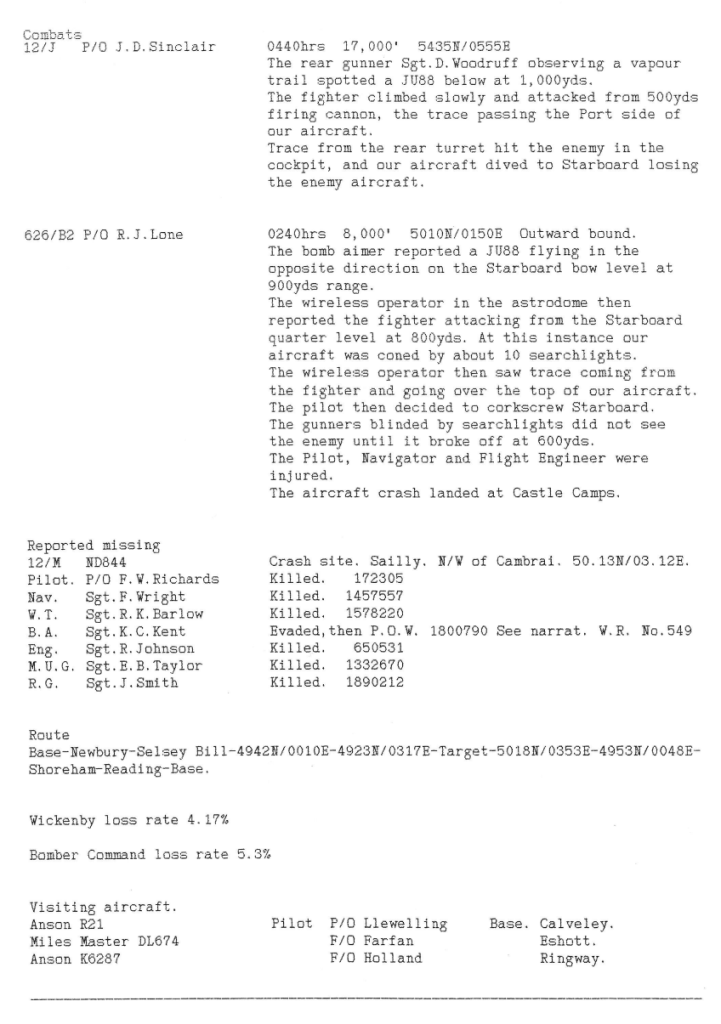 We are now into the period building up to the invasion of Europe in June 1944 – the Battle of Berlin is over and the Luftwaffe night fighters were not the force they were, due to losses caused by US long range fighters. Consequently, we start to see attacks on communication centers in France and Belgium during the following months, with the occasional foray into Germany itself.