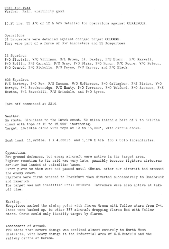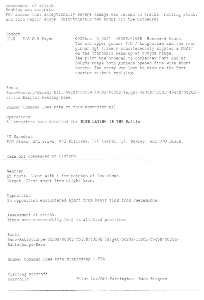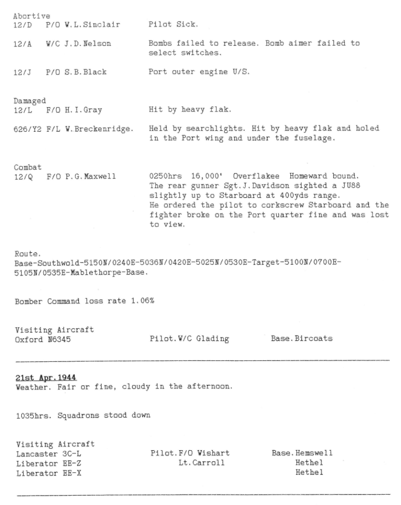 Aircraft from Wickenby continued to support the buildup to D-Day by attacking targets in France, with the odd mission to Germany to try to confuse the Germans. There were no losses this week, however, it is interesting to note that a 12 Sqn aircraft was damaged by an intruder whilst flying circuits around Wickenby on 19th April.