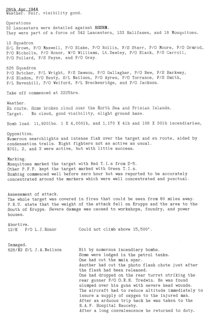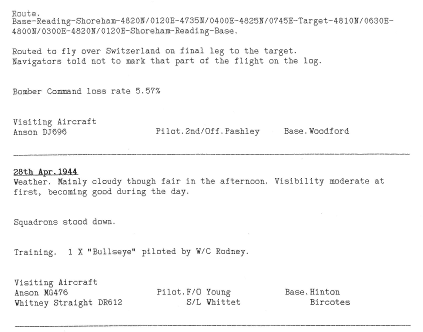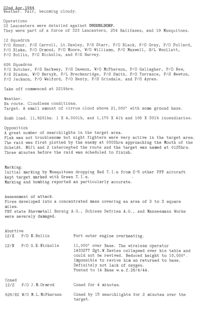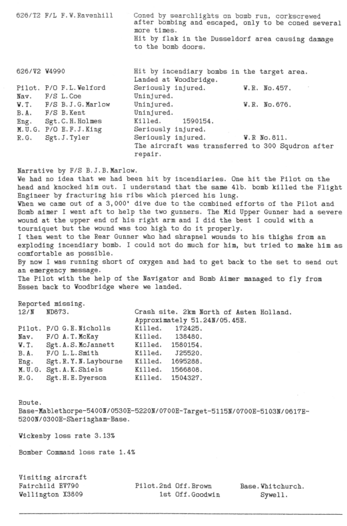 A busy week for RAF Wickenby – operations were carried out to Dusseldorf, Karlsruhe, Essen and Friedrichshafen, with 4 aircraft lost and 36 aircrew killed. Two aircraft returned damaged by incendiaries dropped from aircraft above them, with one flight engineer being killed and 4 others seriously injured – yet another hazard of flying at night in a large stream of bombers.