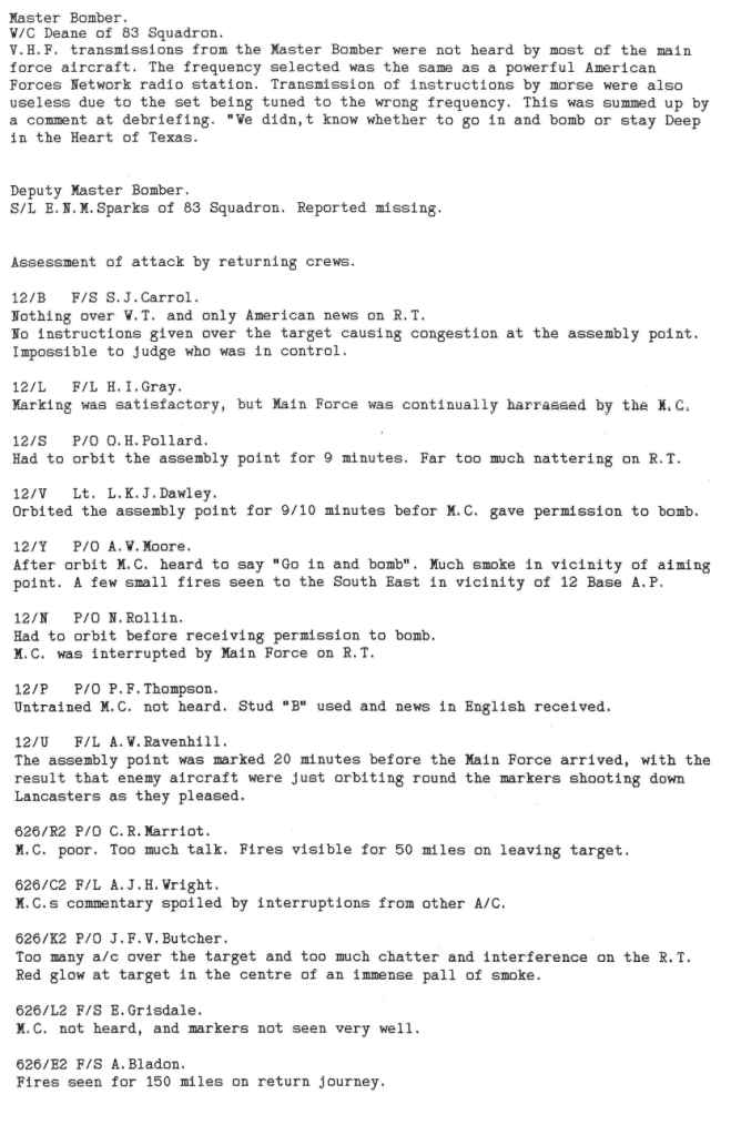 The control of this raid in the target area failed to operate according to plan. The “Marker Leader”, Wg Cdr Leonard Cheshire, ordered the Main Force to bomb but the “Main Force Controller”, Wg Cdr L.C. Deane, could not transmit the order to do so because his VHF radio set was being drowned by an American Forces broadcast and his wireless transmitter was wrongly tuned. German fighters arrived during the delay and bomber casualties were heavy.