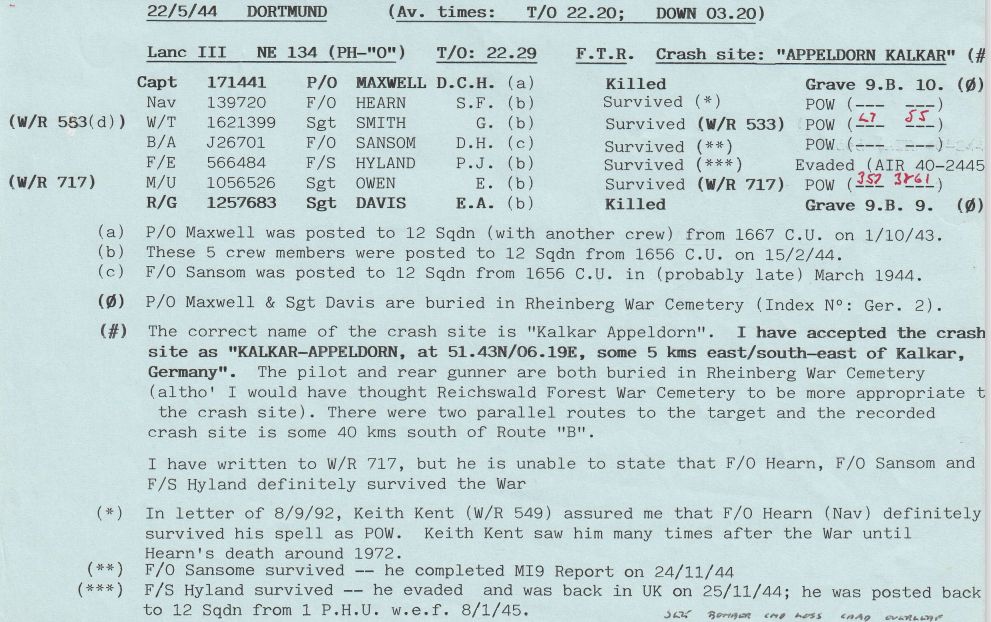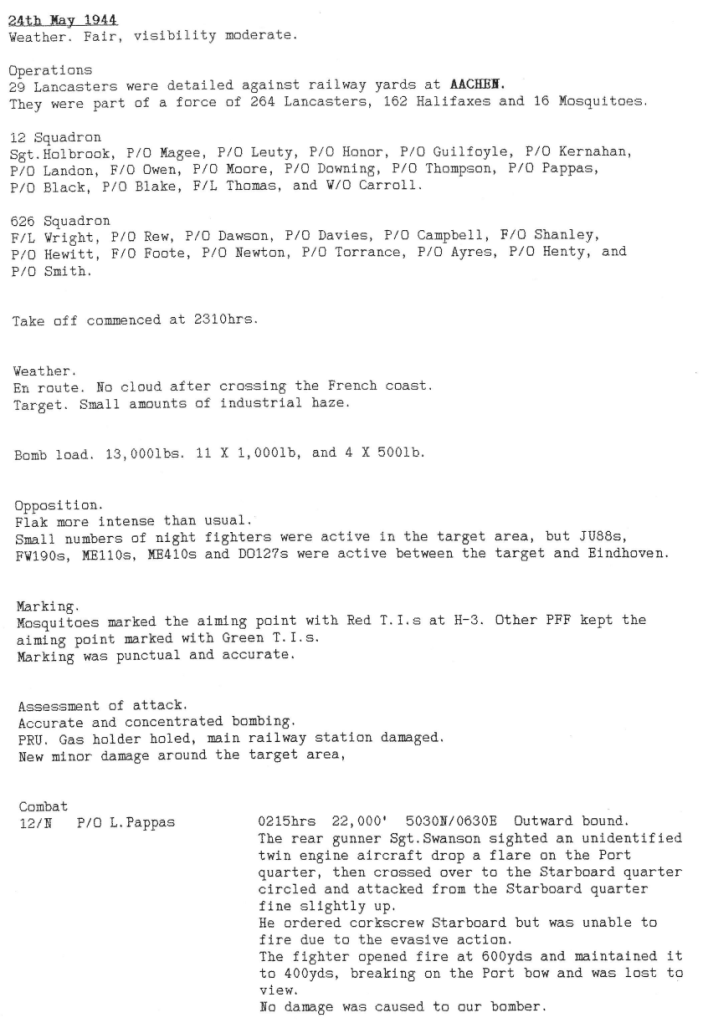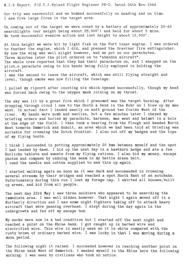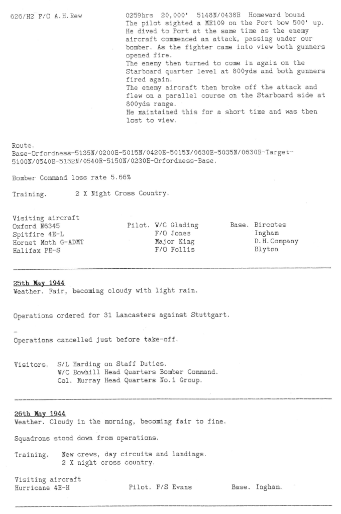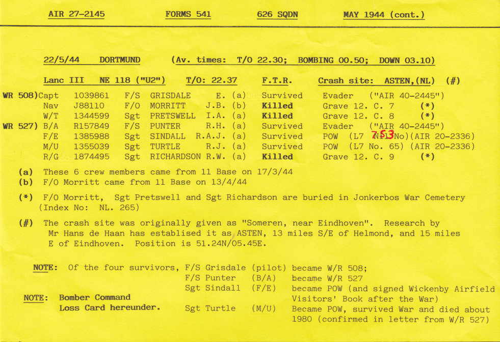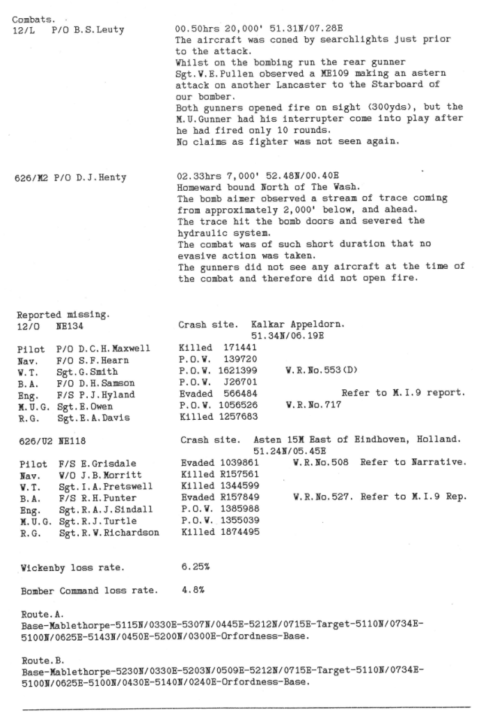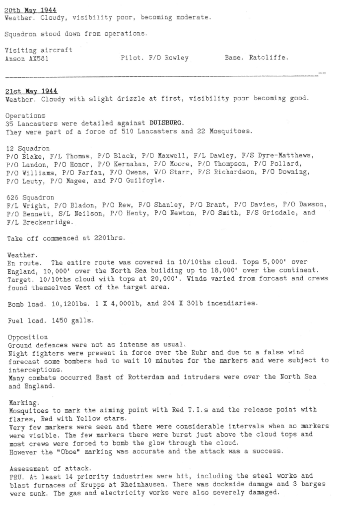 Aircraft from Wickenby took part in 3 raids this week, all to targets in Germany: Duisburg, Dortmund and Aachen. 3 aircraft were lost, 11 aircrew were killed, 6 become POW’s and 5 evaded capture. There are some very comprehensive reports below from some of those who evaded capture, helped by the imminent invasion of Europe by the Allied forces on 6th June and the very active resistance networks that had built up in the occupied countries.