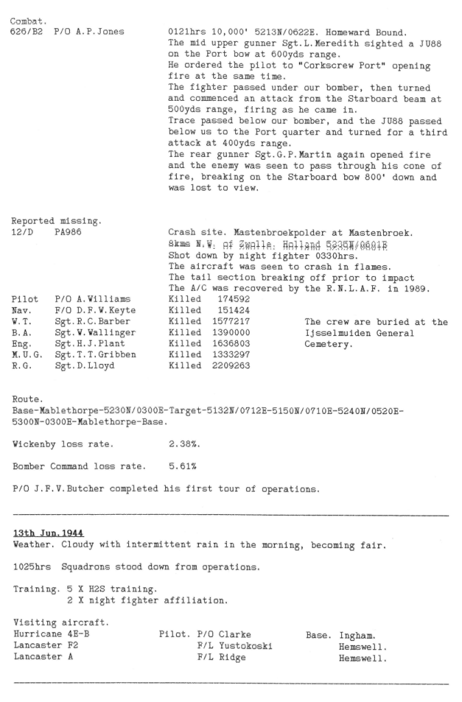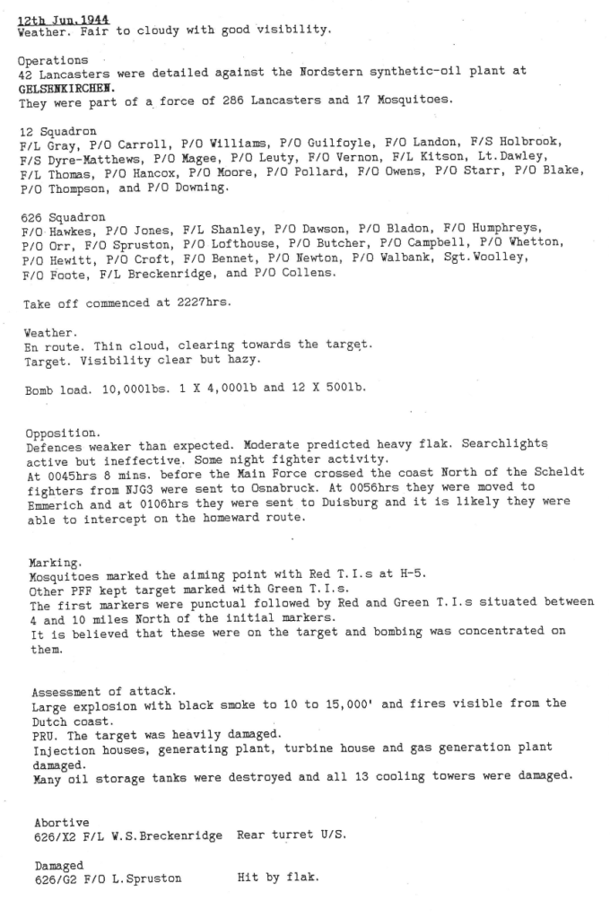 Wickenby continued to provide support to the landings in Normandy but also carried out one attack to Gelsenkirchen, where an experienced crew was lost. That attack was to knock out the Nordstern synthetic oil plant and was very successful due to a more advanced version of Oboe being used to obtain more accurate bombing.
