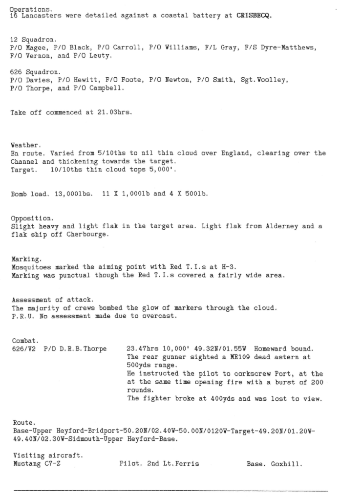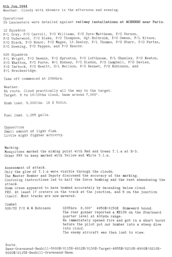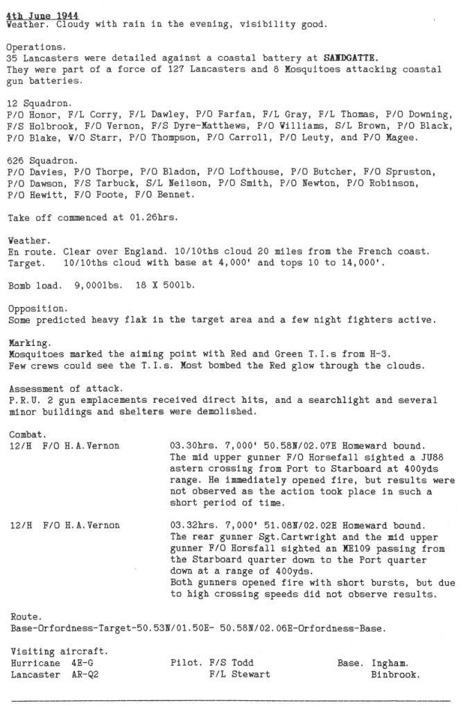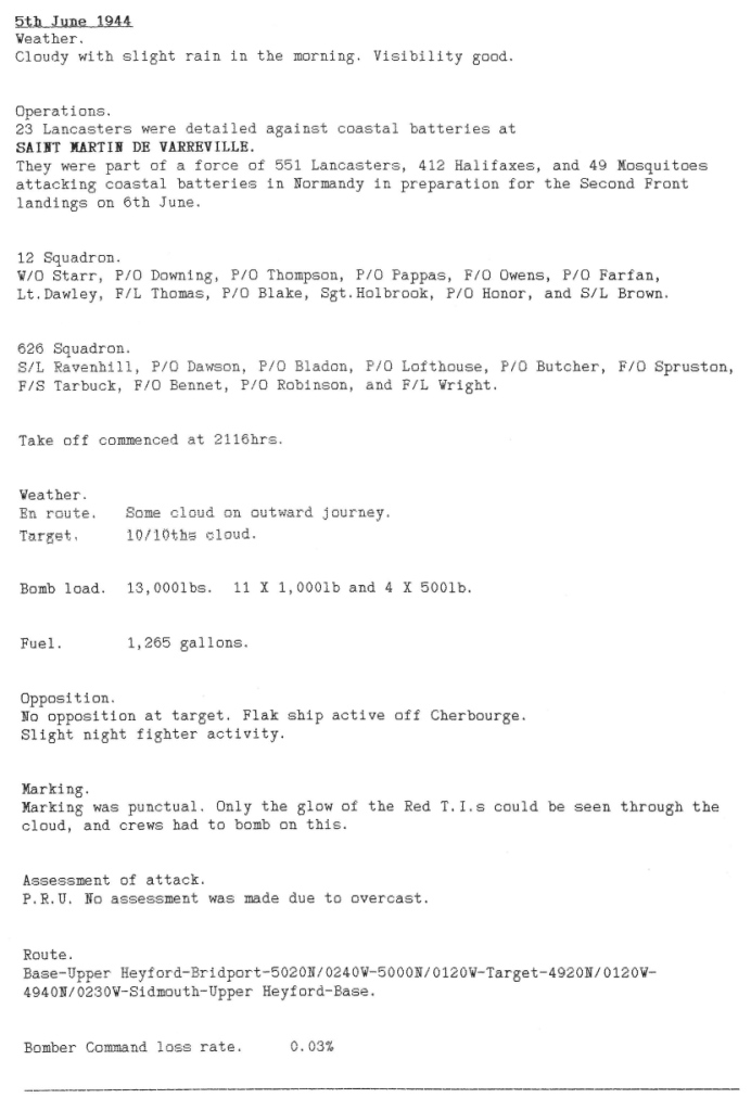 The week of D-Day, the long awaited seaborne invasion of France by the largest flotilla ever assembled. During this week, Wickenby squadrons attacked targets on the coast and inland, helping to disrupt German supplies and troop concentrations. An indication of the importance of these attacks is the number of aircraft able to join the attacks (39 on one occasion, out of 40 on the station) and the low number of early returns.
