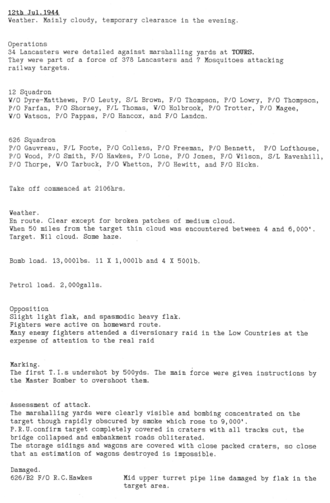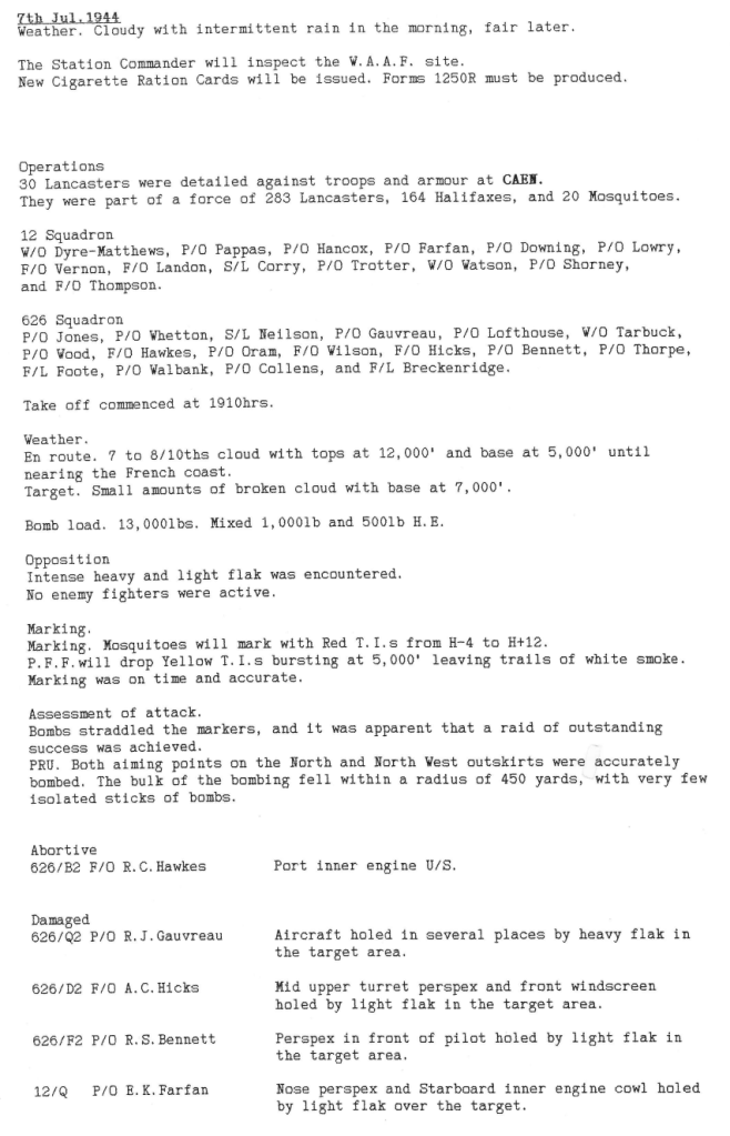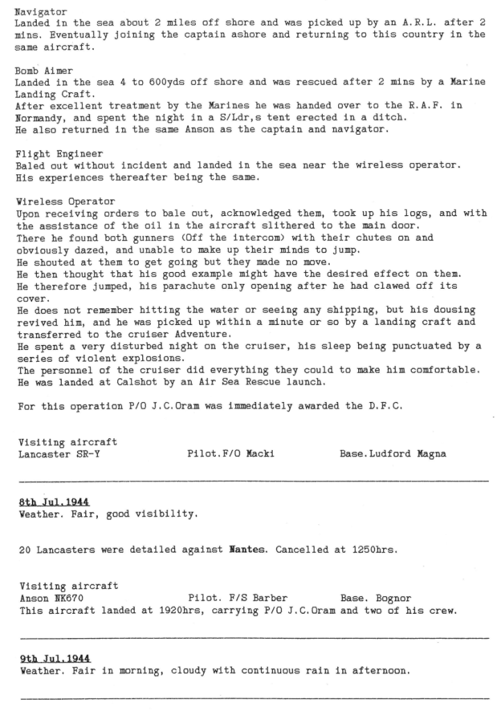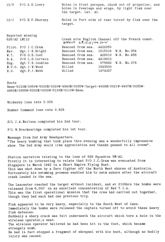There were only 2 operations this week, to Caen and Tours, in support of the Allied forces trying to break out of the Normandy peninsular. One aircraft was lost over the Channel, with 2 aircrew killed. The aircraft lost was piloted by Pilot Officer J Oram, an Australian, who had already survived another crash landing on water in escaping from the Japanese invasion of Singapore. His son, a Wing Commander in the Australian Air Force, visited Wickenby last year with his family.