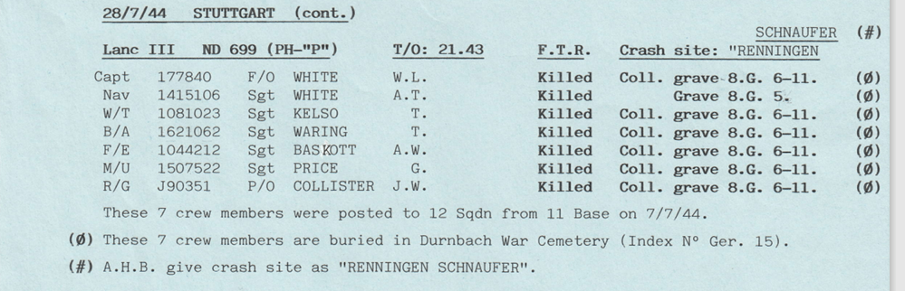 Sgt Keith Eddie, aged 20, the son of James & Jean Eddie of Fraserburgh, Aberdeenshire. He was the mid-upper gunner in the aircraft flown by FS Ryan which was lost, with all the crew, during the attack on Stuttgart on the night of 28/29 July 1944.