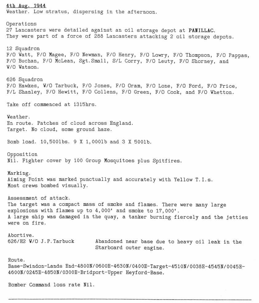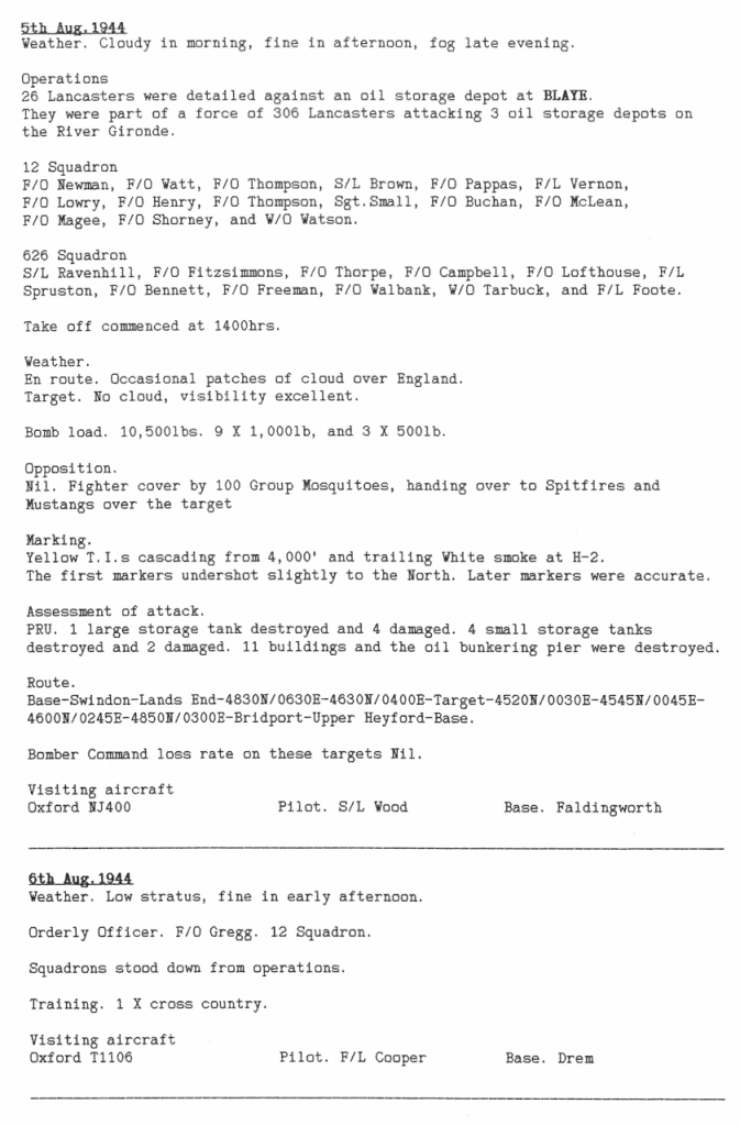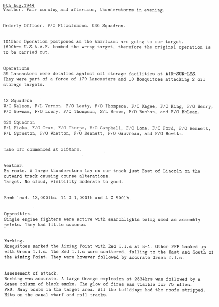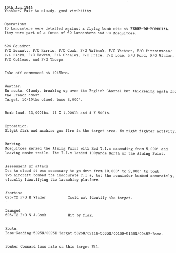 All attacks made this week were to targets in France, including oil storage, close support for Allied ground troops and mine laying. One aircraft was lost returning from the mine laying with 5 aircrew killed and 2 badly injured. Also of note is the fact that some of these missions were being flown during daylight, some with Mosquito fighter support, which helped with accuracy.