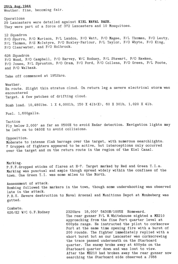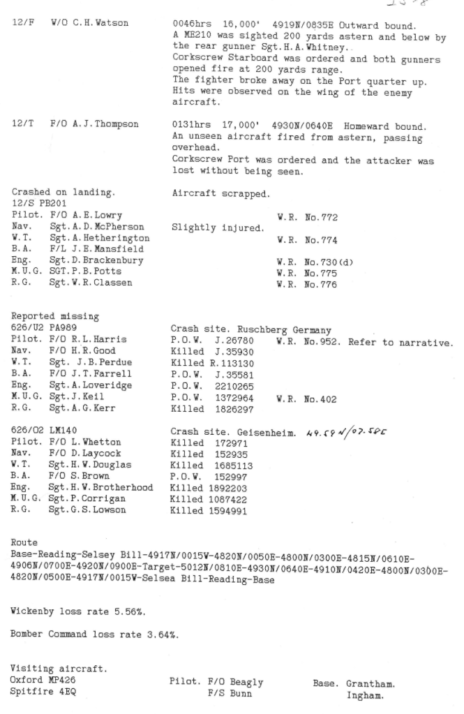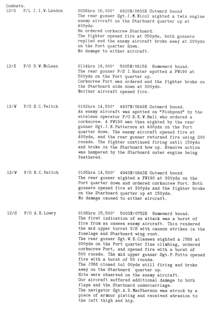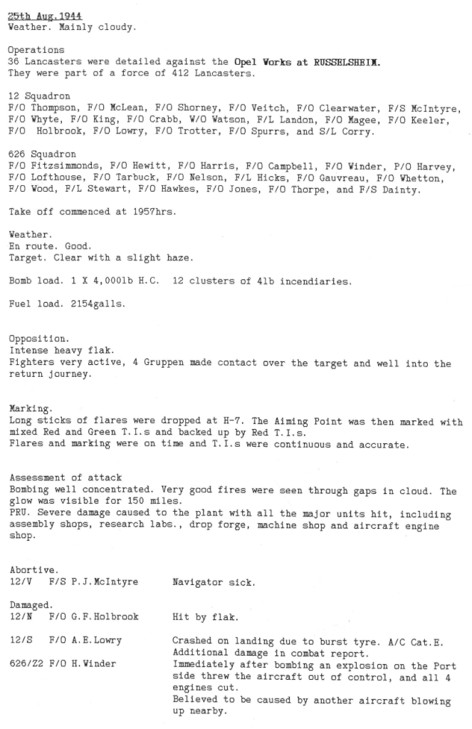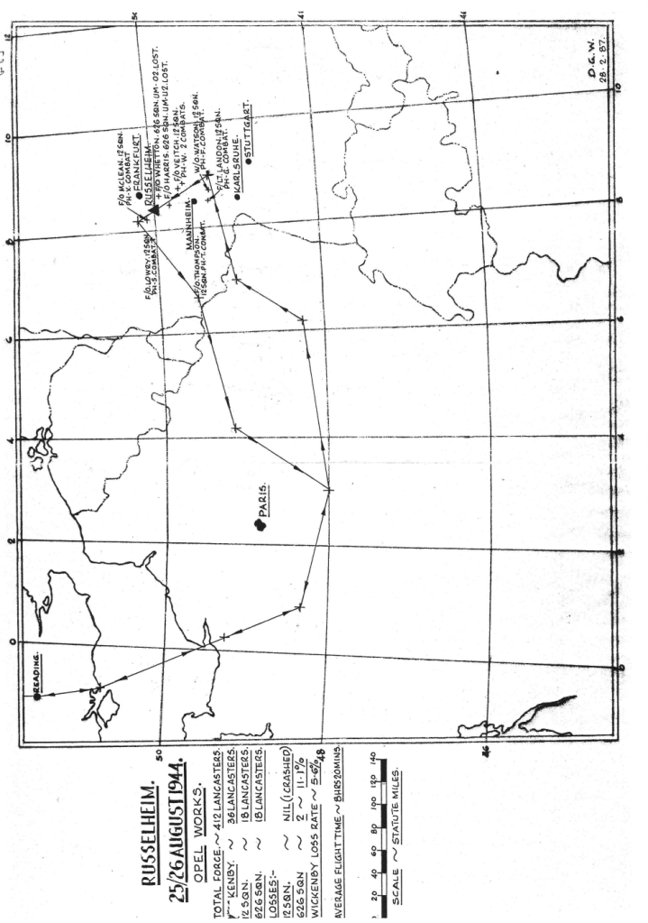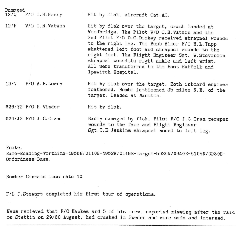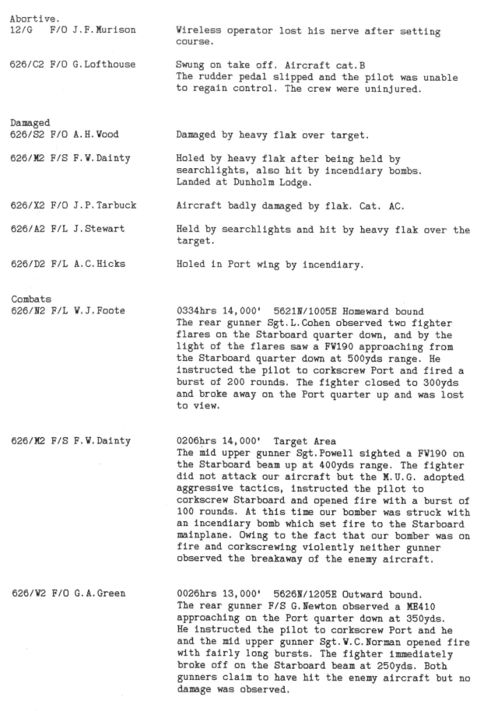 There were heavier losses this week than had been the case since the Mailly-le-Camp attack in May, 6 aircraft being lost during operations and one lost on landing at Wickenby – 26 aircrew were killed, 10 became POW’s and 8 were interned in Sweden, but were back in the UK by October. Reading the damage and combat reports, it is also clear that several aircrew also received wounds that took time for them to recover from. Attacks were made to targets in Germany as well as a V2 rocket site and storage area.
