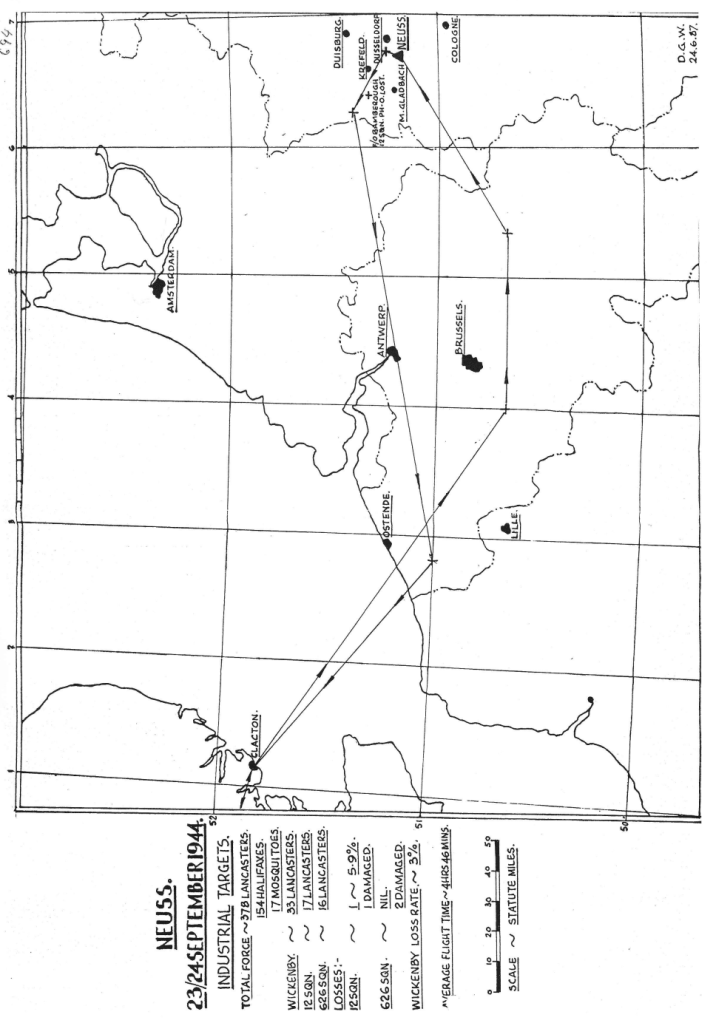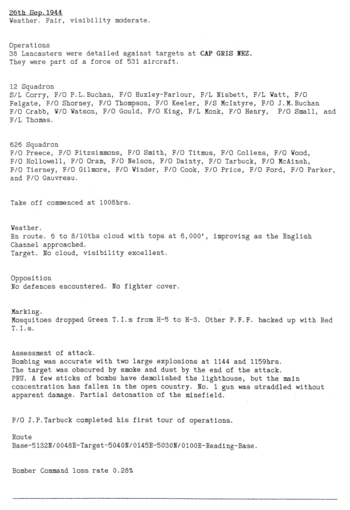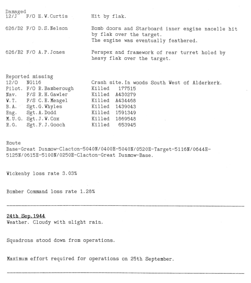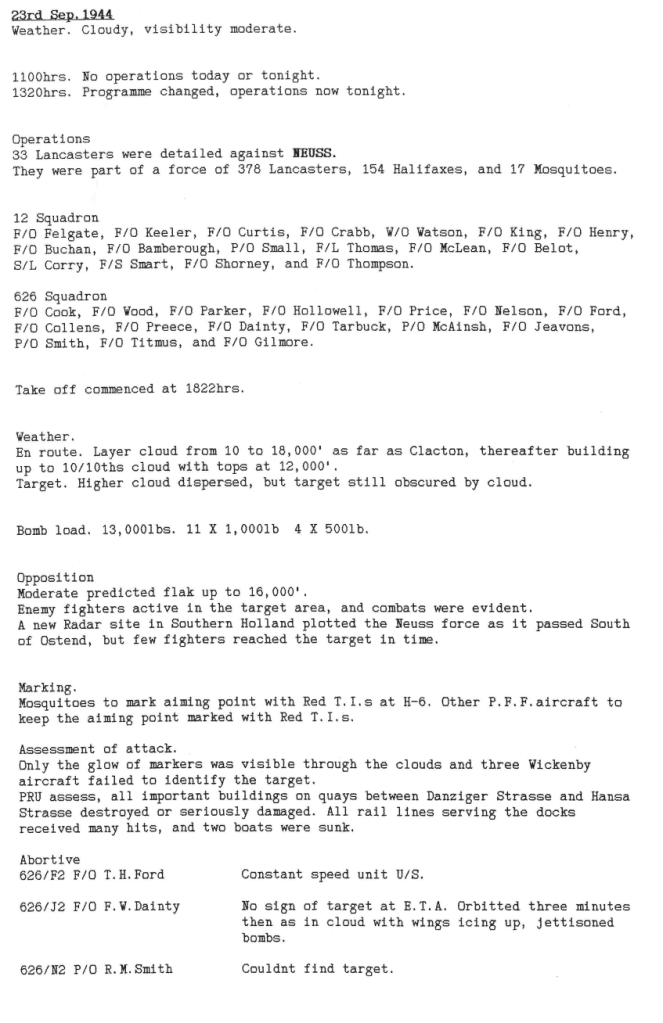 Only 3 missions this week, one of which was cancelled by the master bomber due to cloud covering the target area in Calais – this was probably to prevent bombs landing on friendly troops besieging the port and to reduce civilian casualties. Another point to note is that all the missions were flown in daylight. One aircraft with the entire crew were lost.