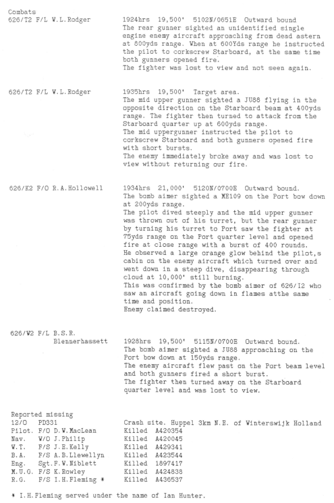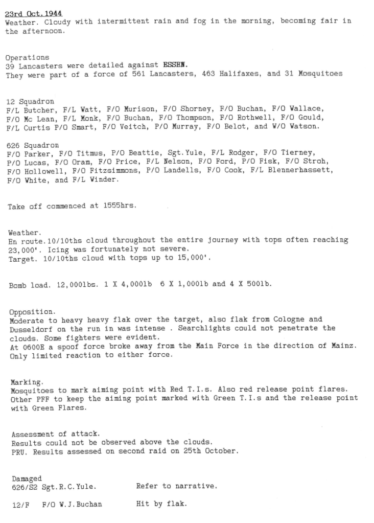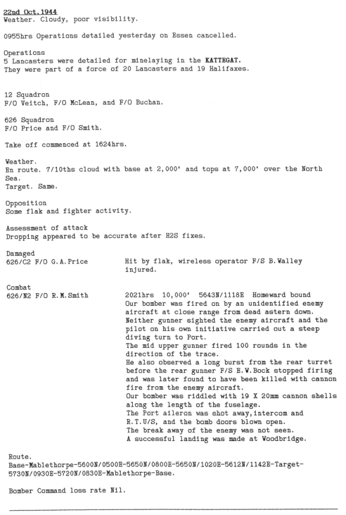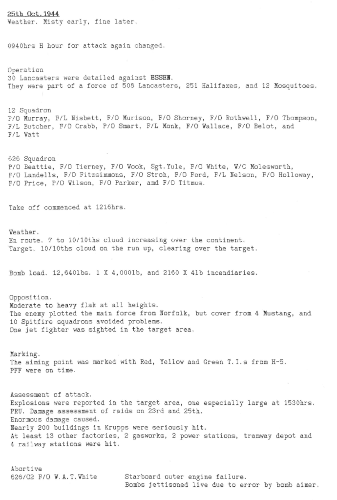 Wickenby aircraft were involved in 3 missions this week; minelaying in the Kattegat and twice to Essen – 8 aircrew were killed and one aircraft was lost. A rear gunner was killed by a night fighter during the minelaying and 7 aircrew were killed in the first mission to Essen, where Sgt Yule and his crew were lucky to return when hit be a 4000 lb “cookie” dropped from above (see Station Diary). It is also interesting to note that a jet fighter was observed during the second Essen operation.