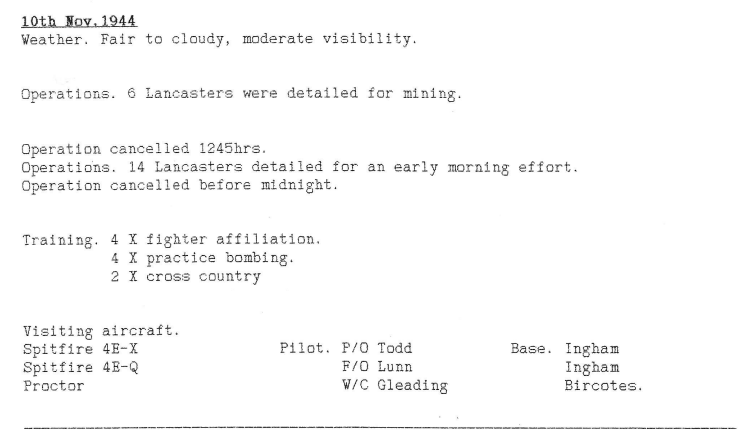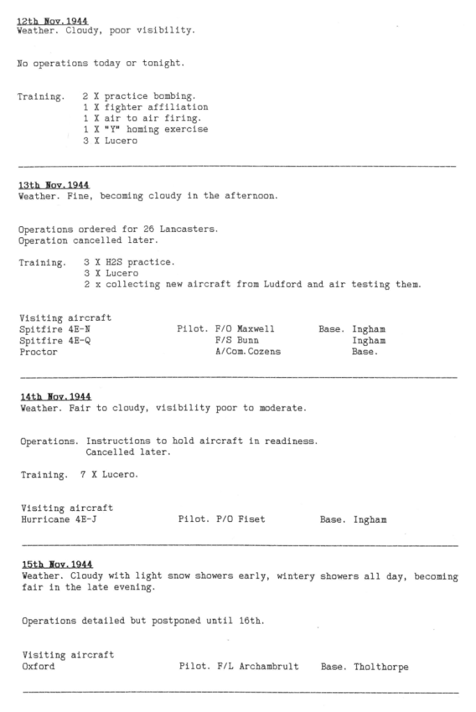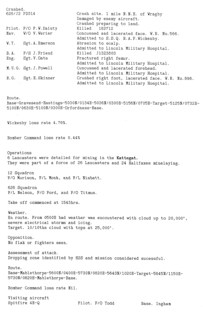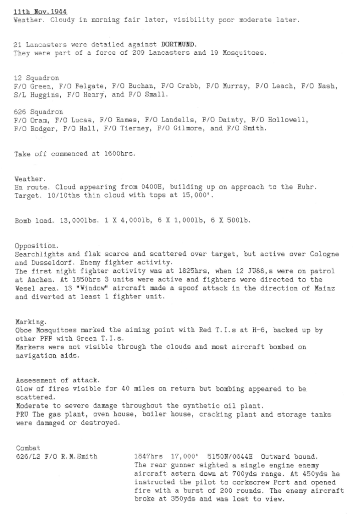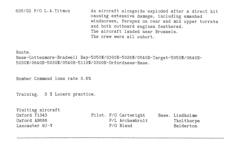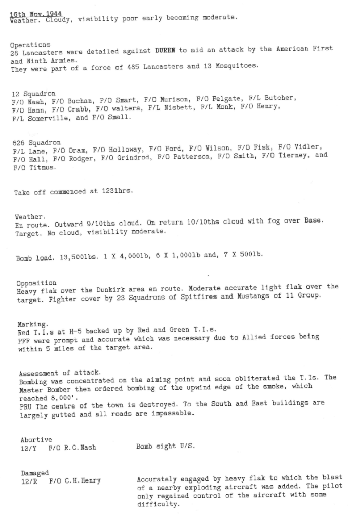 A pretty standard week for RAF Wickenby squadrons, with 3 operations; Dortmund, mine laying in the Kattegat and American Army support by bombing the town of Duren, which is between Aachen and the river Rhine. One aircraft was lost on return from the Dortmund raid, with 2 aircrew killed and 5 injured – the crew of Fg Off Dainty were on there 23rd mission. A second aircraft was badly damaged during the Duren attack by another aircraft exploding nearby, forcing it to land near Brussels (see Station Diary below).