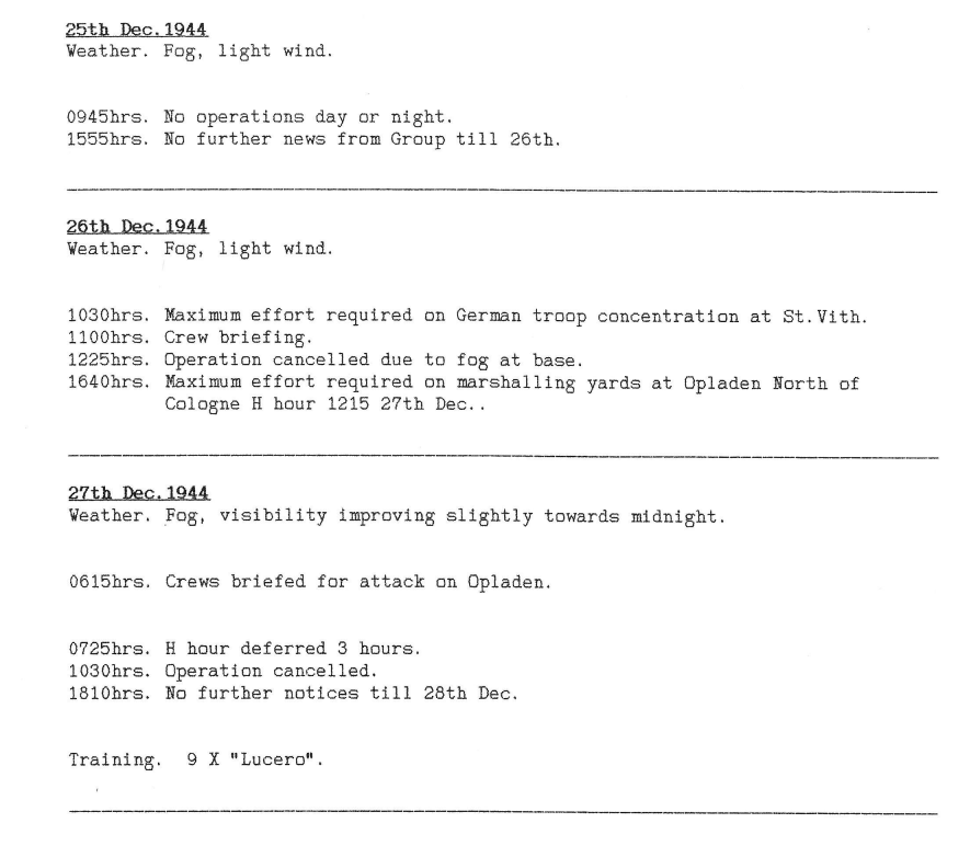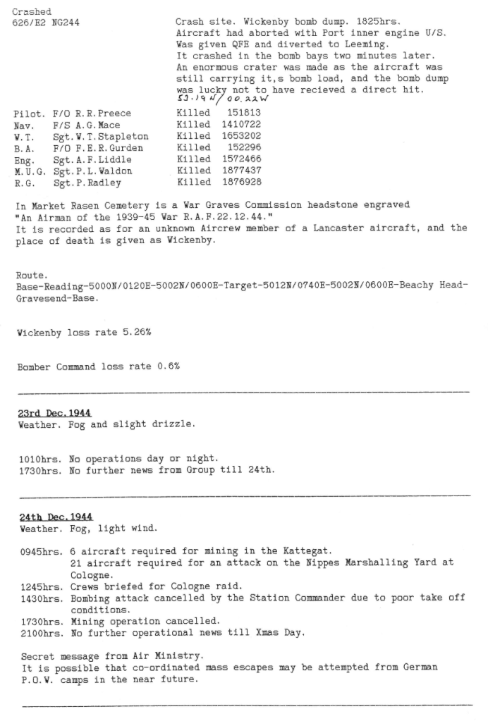 On the afternoon of 22 December 1944 the crew of Lancaster NG244 ‘Easy Two’ climbed aboard their aircraft in preparation for their twenty-second mission, they took off at 15.23 hours with 13 other 626 Squadron Lancasters on a sortie to bomb the railway facilities at Koblenz in Germany. They were to be part of a 166 strong Lancaster force on this raid. Some time after take off the aircraft’s port inner engine failed and the pilot was forced to abandon the mission. He turned the aircraft around and returned to base. By now the weather at RAF Wickenby had turned bad with poor visibility due to heavy rain and fog was starting to form over the airfield, it was also now becoming dark.