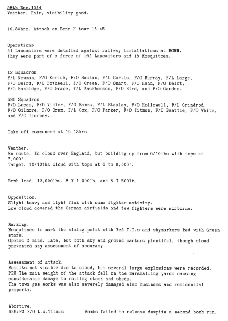 There were 2 missions this week, to Koblenz and Bonn in Germany, with one aircraft and all its crew lost on their return to Wickenby following the Koblenz attack. The aircraft crashed near the station bomb dump and it is fortunate that there wasn’t a more serious incident as it still contained most of its bomb load.