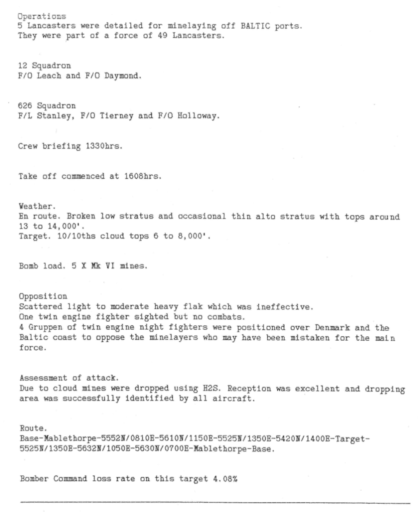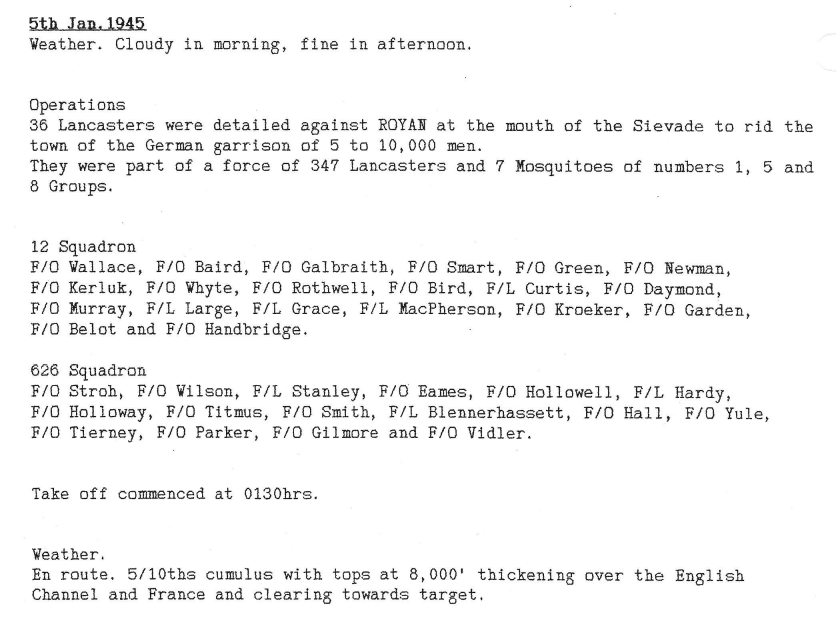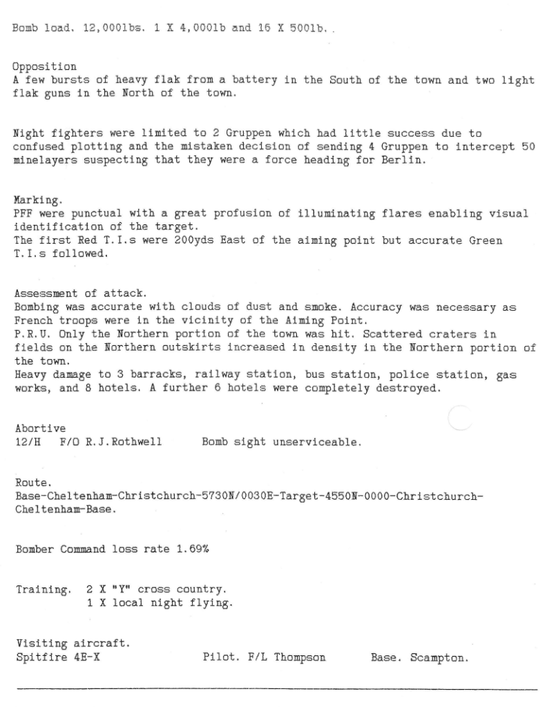 There were a variety of targets during this week, Royan in the Gironde district of France, Neuss and Munich in Germany and minelaying in the Baltic. The raid on Royan was particularly tragic – the town was being besieged by French Resistance fighters led by Free French officers but they were making no progress as they had no artillery. It was suggested (facts are disputed) by an American officer that the town be softened up by Allied bombing as the only residents left in the town were “collaborators” (this was not true – there were believed to be 2000 civilians present, who stayed to protect their homes) – once SHAEF heard of the proposed bombing, they cancelled it, but the message did not get through to Bomber Command and a large part of the town was destroyed and several hundred civilians were killed. There were recriminations for several years and one French general committed suicide.