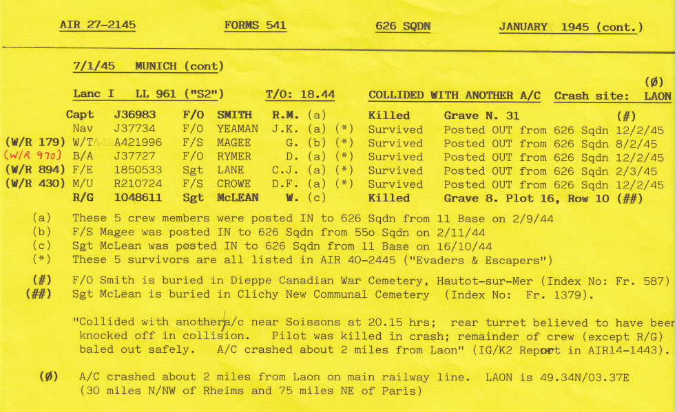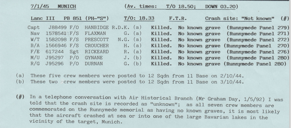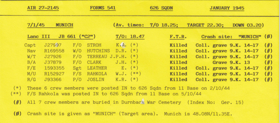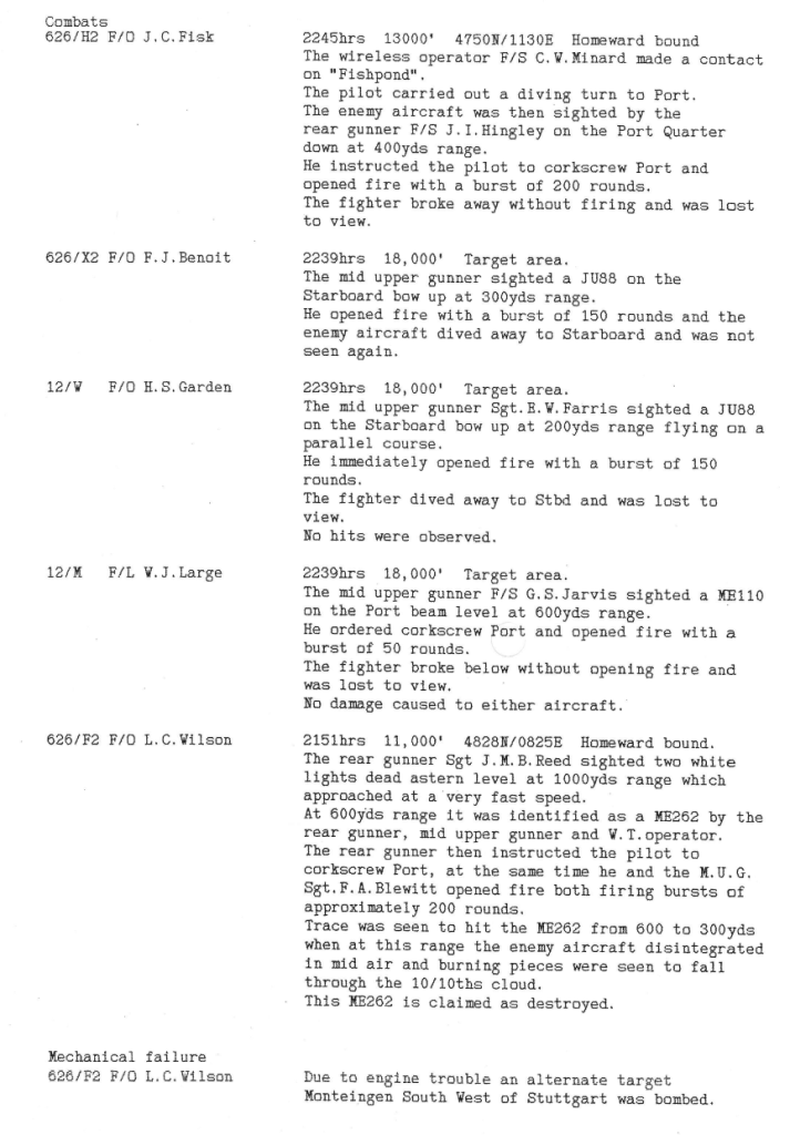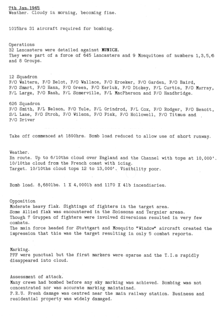 Wickenby squadrons lost 3 aircraft on the Munich mission, with 16 aircrew being killed and 5 evading capture.