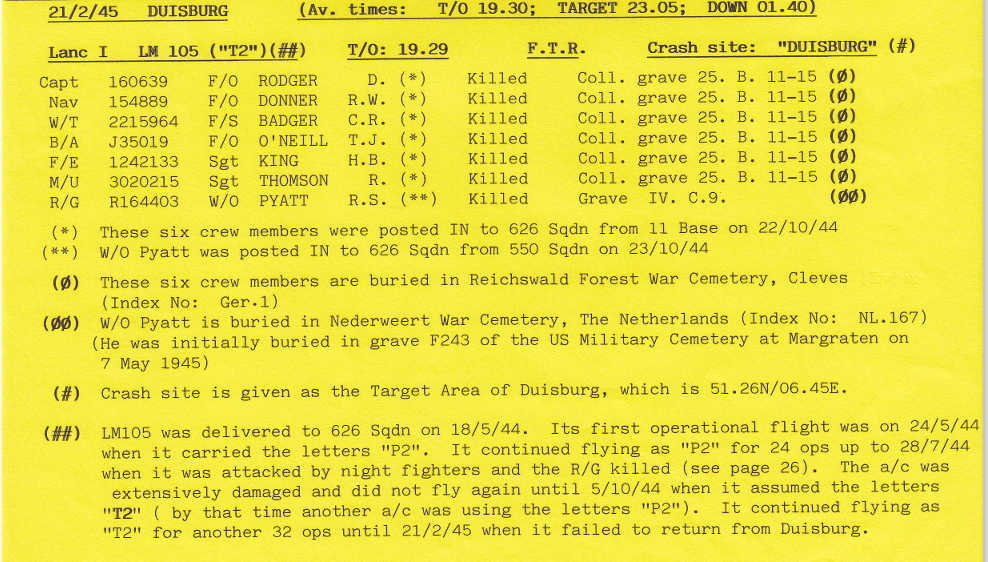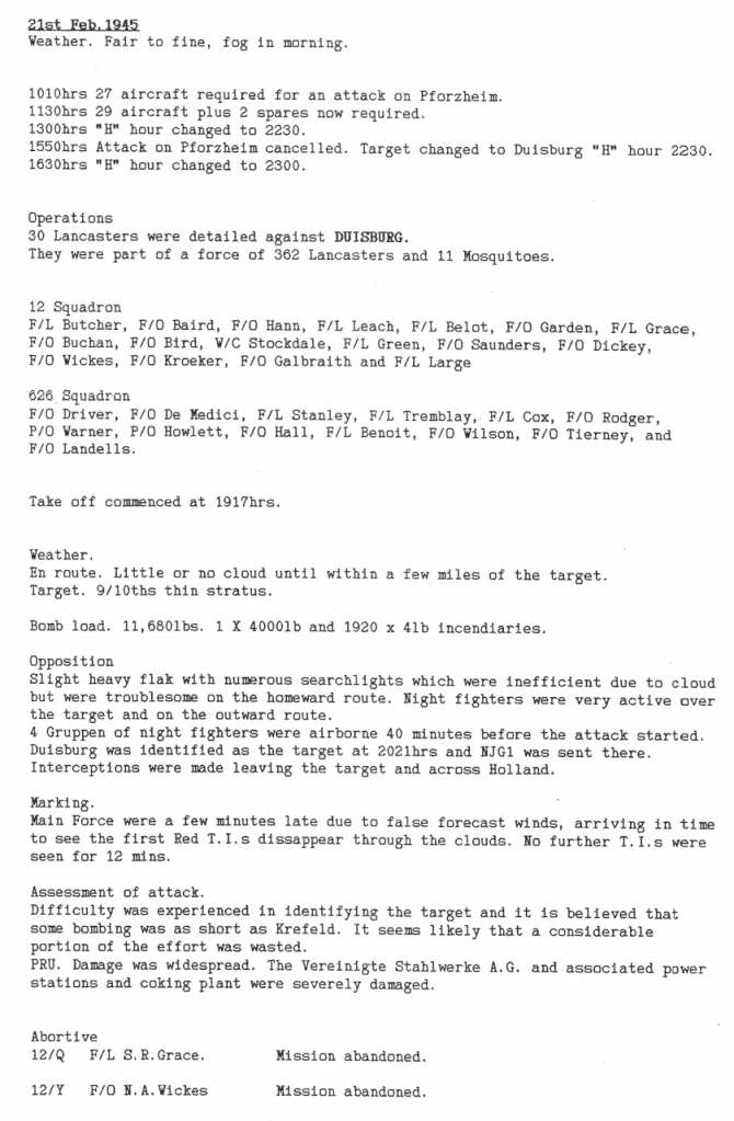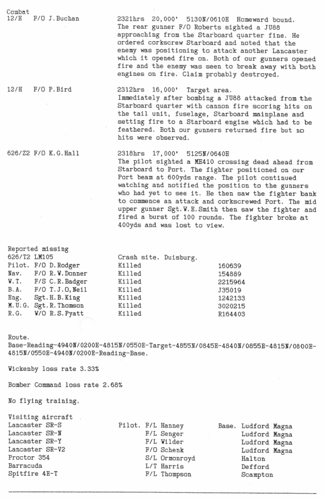 There were 3 operations this week, all to targets in Germany- minelaying in the Heligoland Bight, and bombing attacks on Duisburg and Dortmund – 4 aircraft were lost, 27 aircrew were killed and one was believed to have evaded capture, all these casualties were from 626 Sqn.