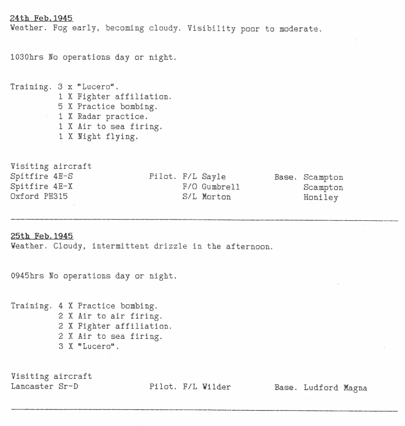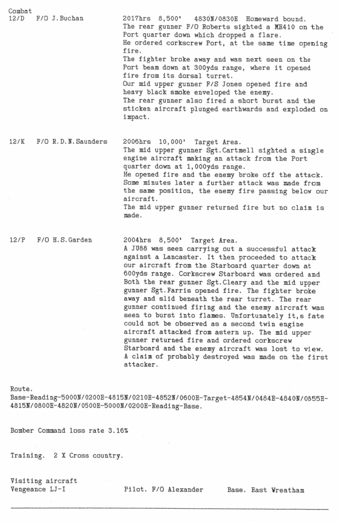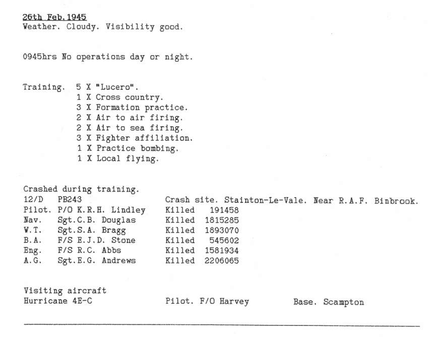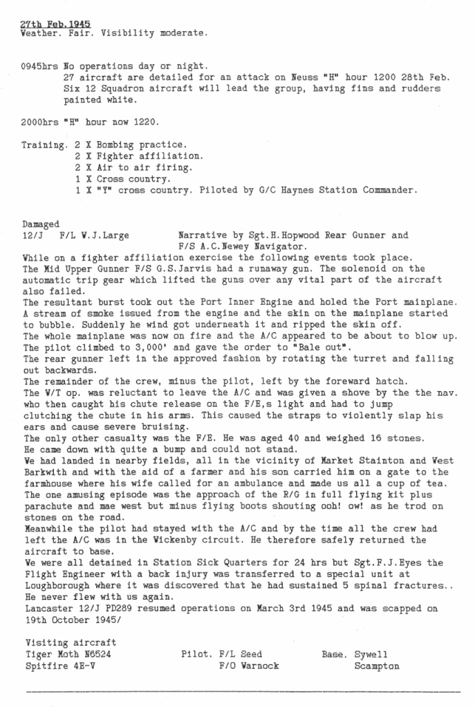 Only one aircraft was lost this week, on a training flight, with 6 aircrew killed, but one other was seriously damaged, following an out of control rear turret (see Station Diary below), whose machine guns caused all the crew but the pilot to bail out. The Flight Engineer was so seriously injured he did not fly again.