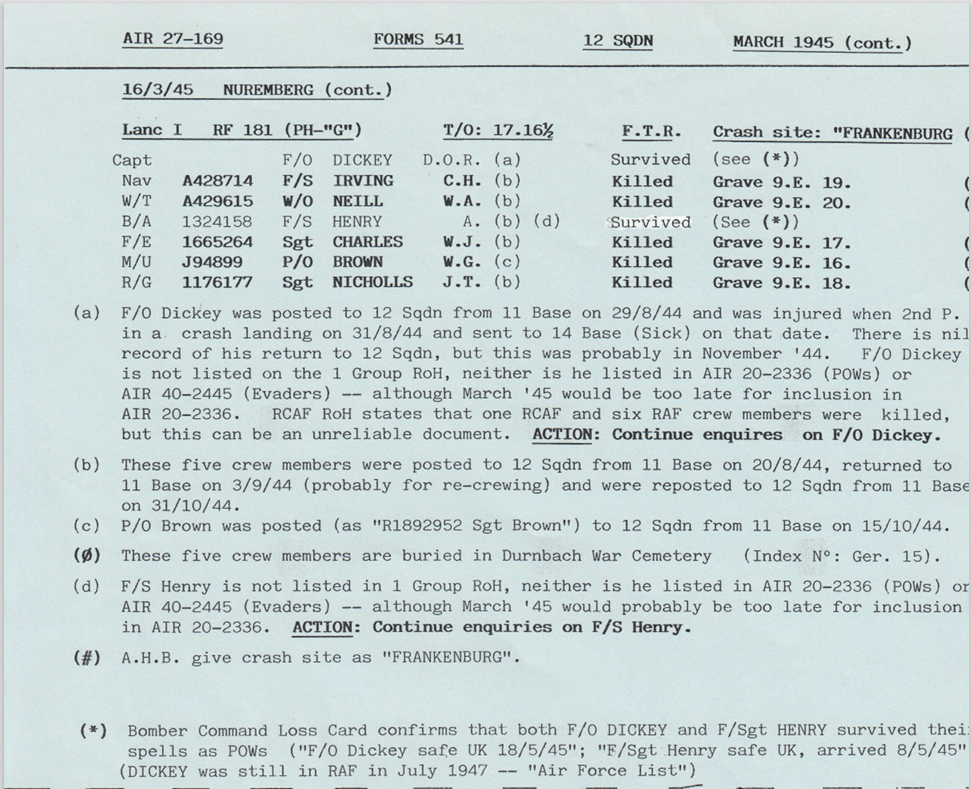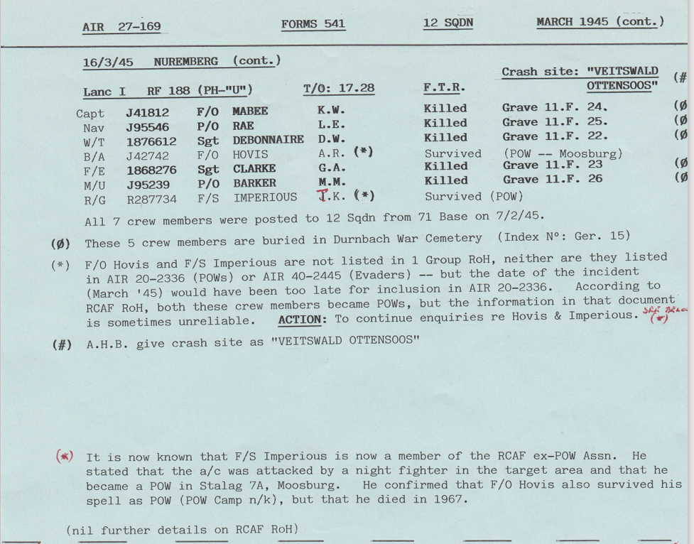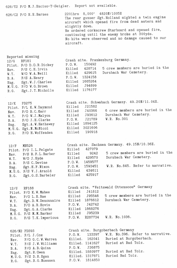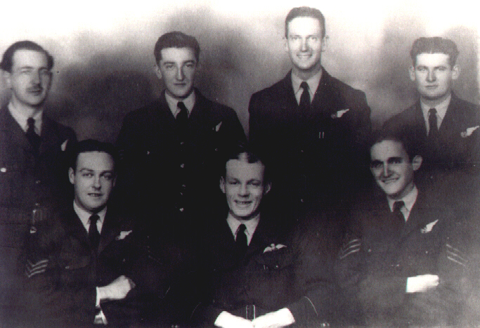 The crew of Pilot Officer Ian Felgate, the son of John Murchison Felgate & Millie Fay Felgate of Trayning, Western Australia, which included 4 other Australians, who were shot down during the attack on Nuremburg on 16 March 1945. Only the flight engineer and the bomb aimer survived as POW’s.Top L to R, F/Sgt C Devine – B/A, W/O H Nixon – F/E (845), F/Sgt T Lamprell – Nav. F/Sgt V Arnold – M/U, Bottom L to R F/Sgt G Barbeler – R/G, F/O M Felgate – Pilot, F/Sgt J Hyde – W/OpThe crew of Fg Off Keith Mabee, RCAF, who were shot down on the Nuremburg raid. Five were killed and 2 became POW’s.