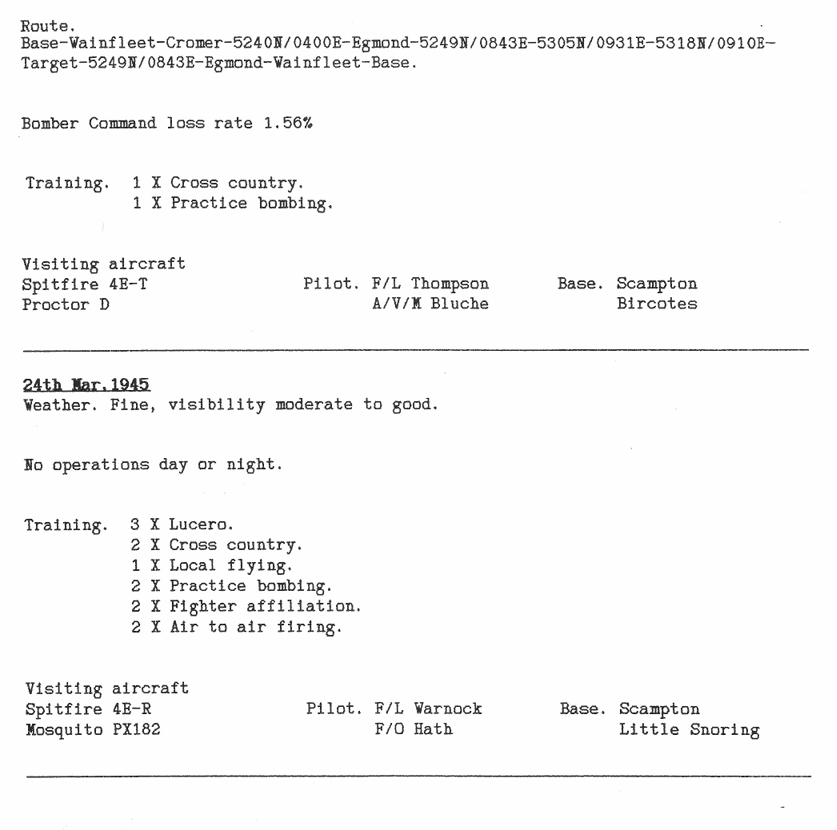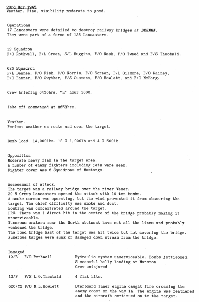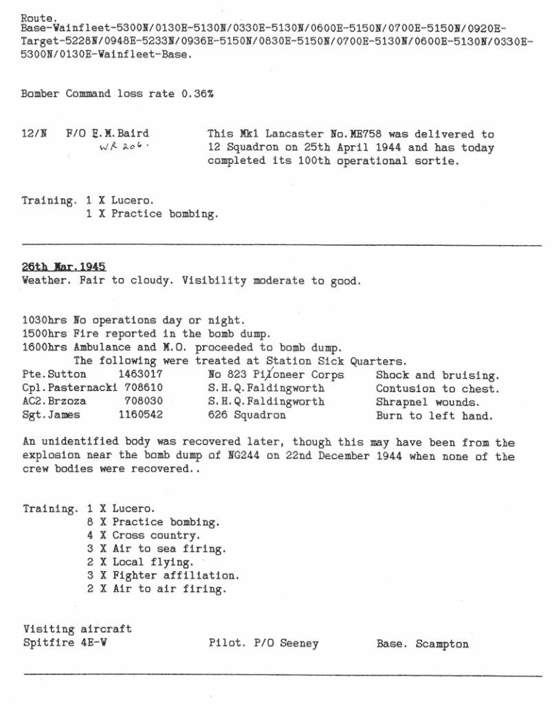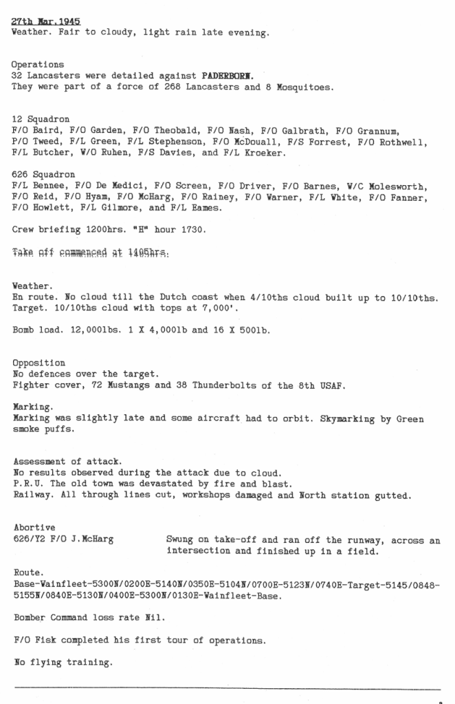 There were 3 operations this week, to Bremen, Hannover and Paderborn – there were no losses. On the 26th March there was a fire in the bomb dump, where 4 men were injured by incendiaries (I’ve included an article written many years later that gives further details).