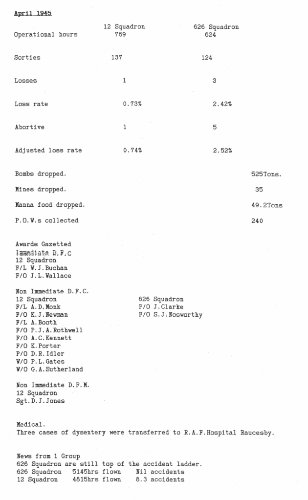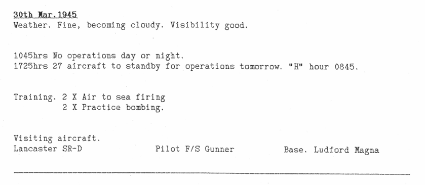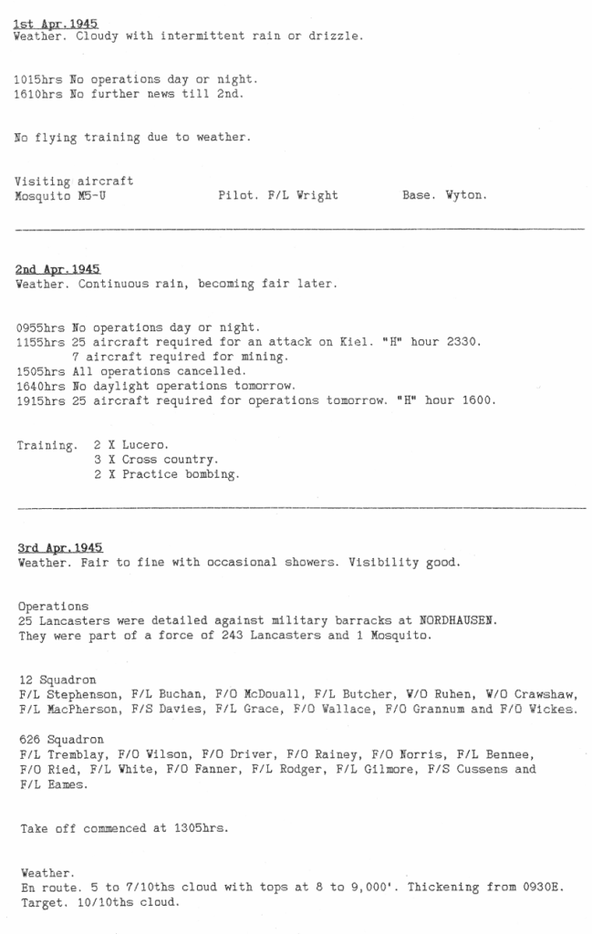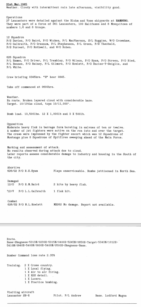 Just 2 missions were flown from Wickenby this week, to Hamburg and Nordhausen, both of which sustained extensive damage. One aircraft and all 7 crew were lost during the latter attack, the only loss for Bomber Command that day. It is worthy of note that most missions were now during daylight hours and heavily escorted by long-range USAAF and RAF fighters, who were encountering a number of Luftwaffe jets.